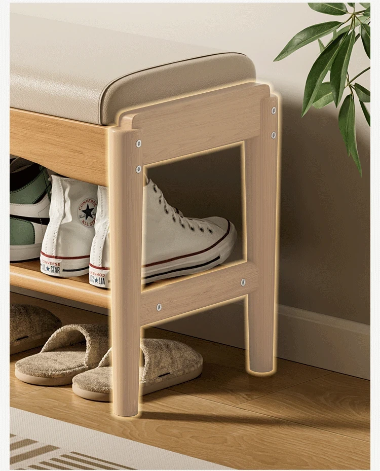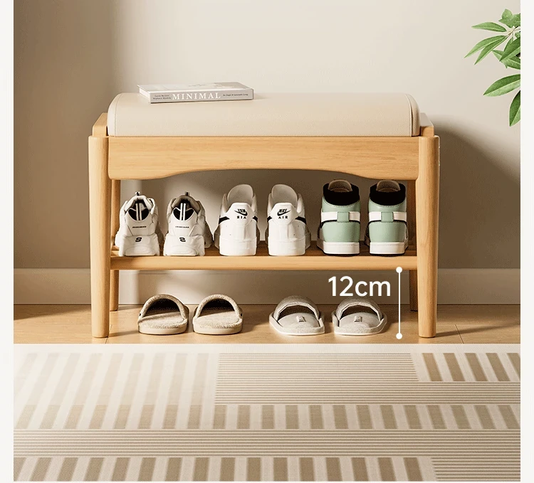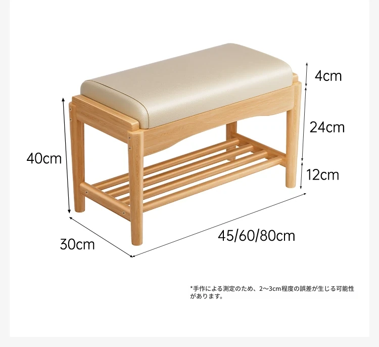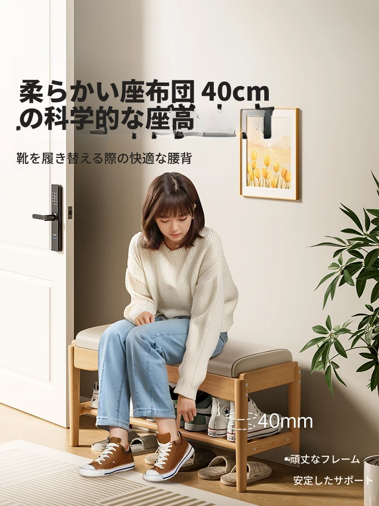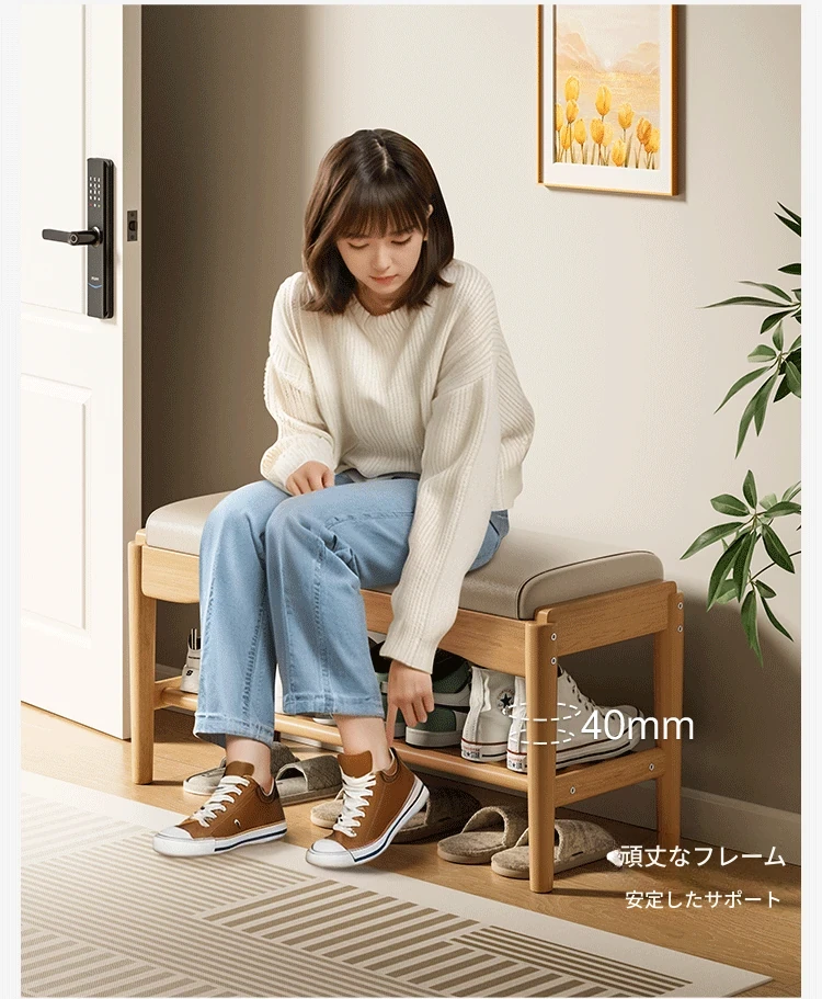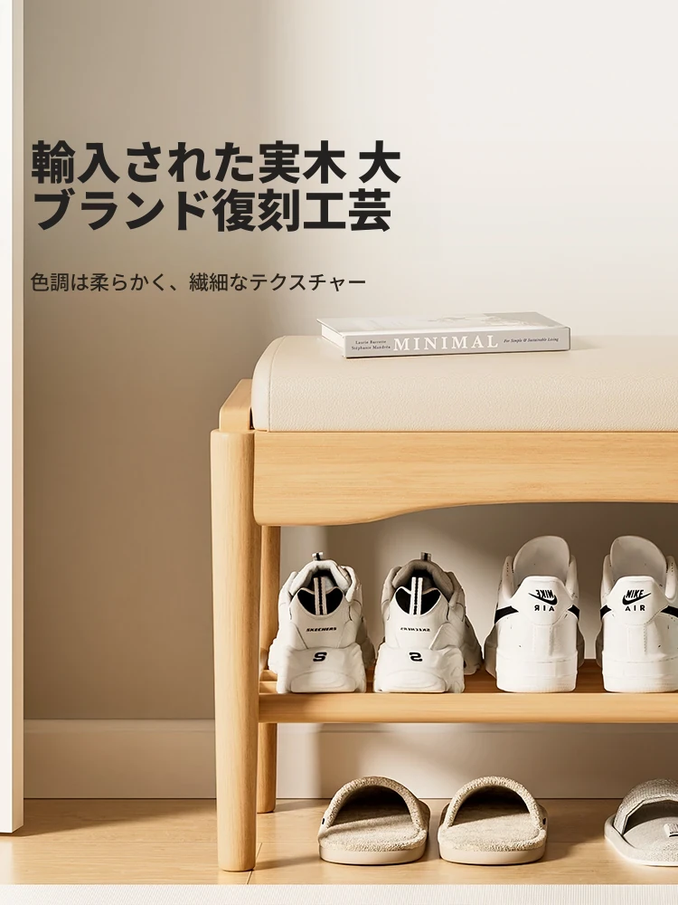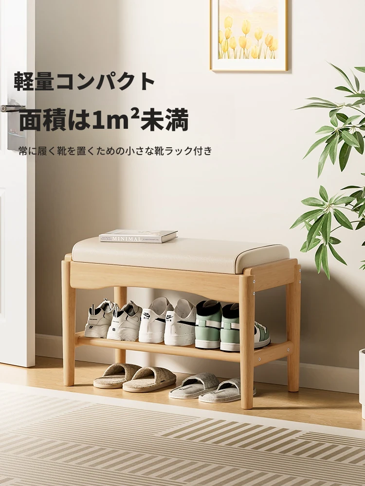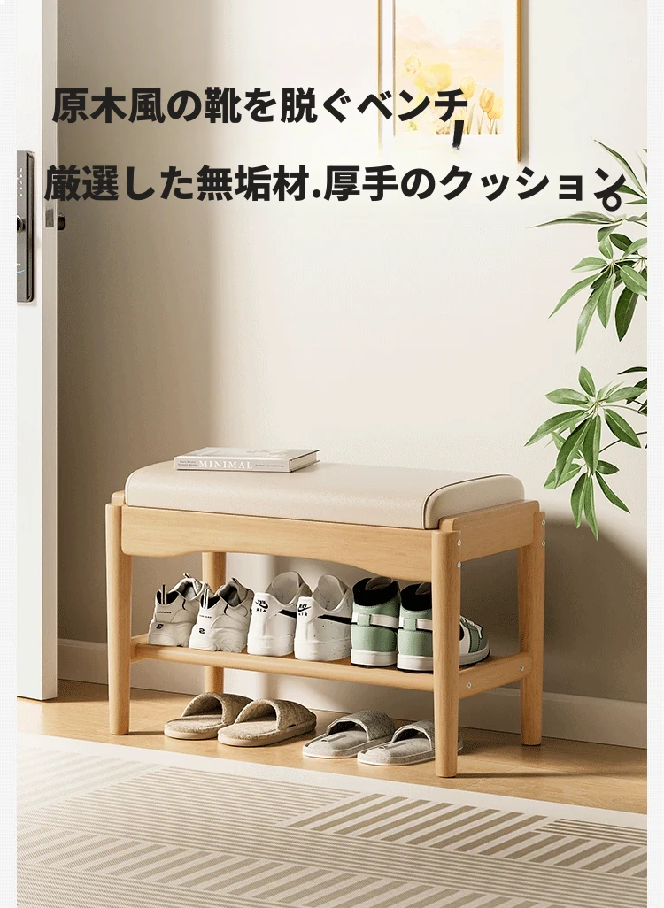 玄関用スリッパ収納ベンチ - コンパクトな天然木製、クッション付きで座り心地抜群!靴を収納しつつ、シンプルでスタイリッシュなデザインで、入居時の利便性をアップ!