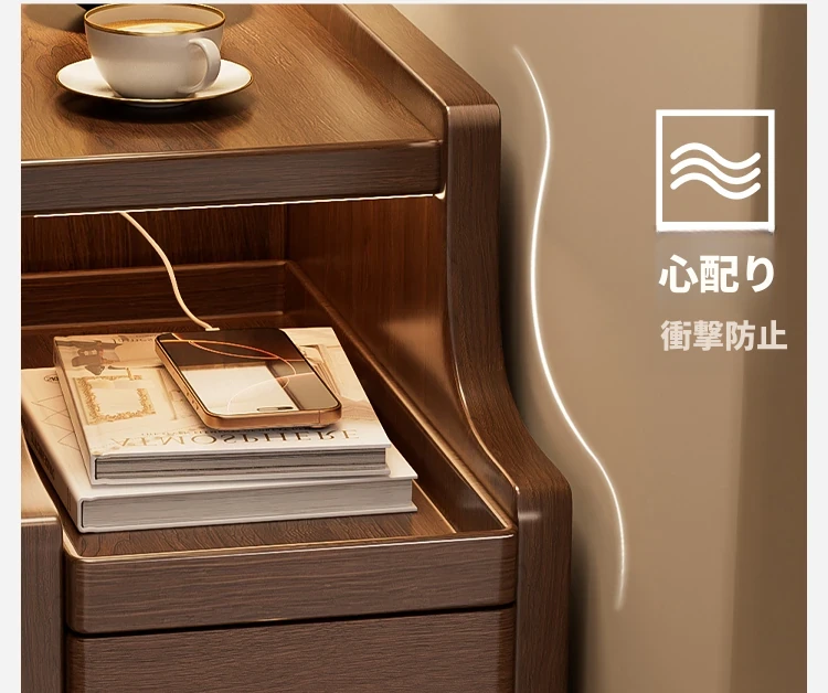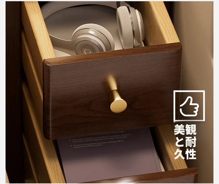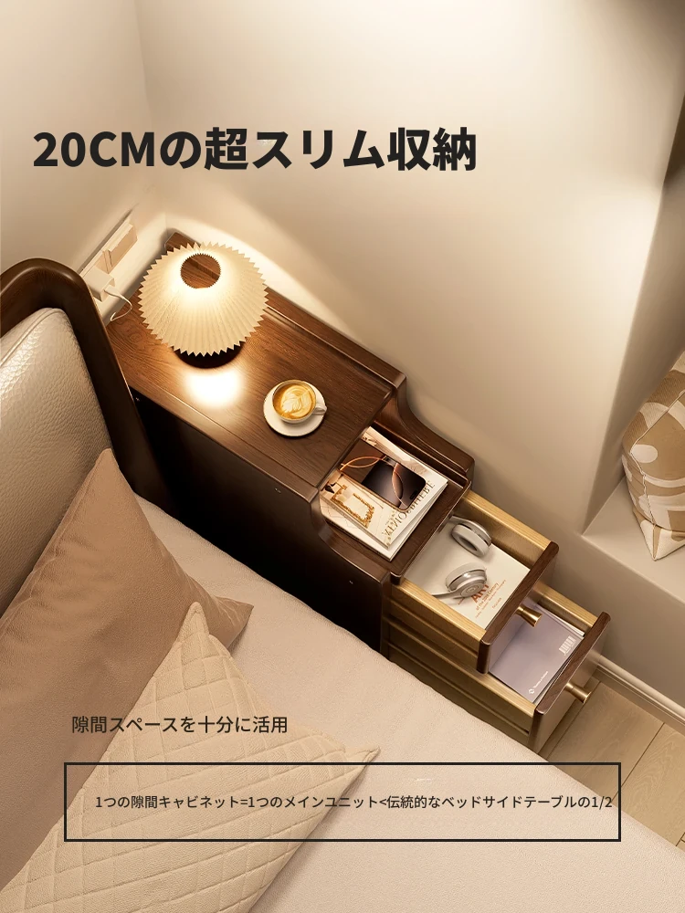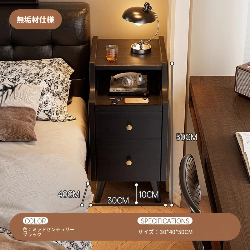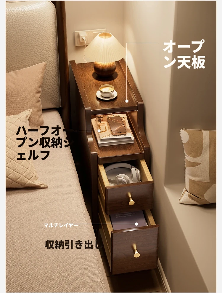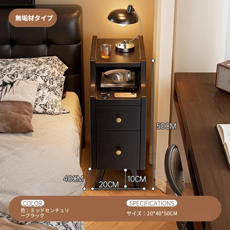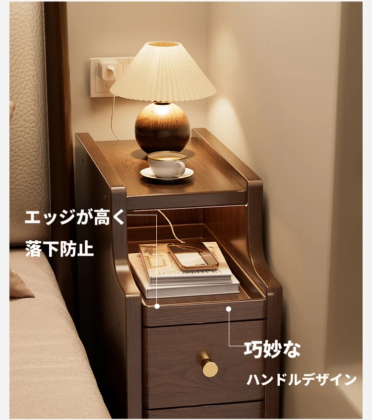 極薄デザインの無垢材ベッドサイドキャビネット|狭いスペースにもぴったりなシンプル収納|小型・ミニチェストでお部屋をスッキリ整理!