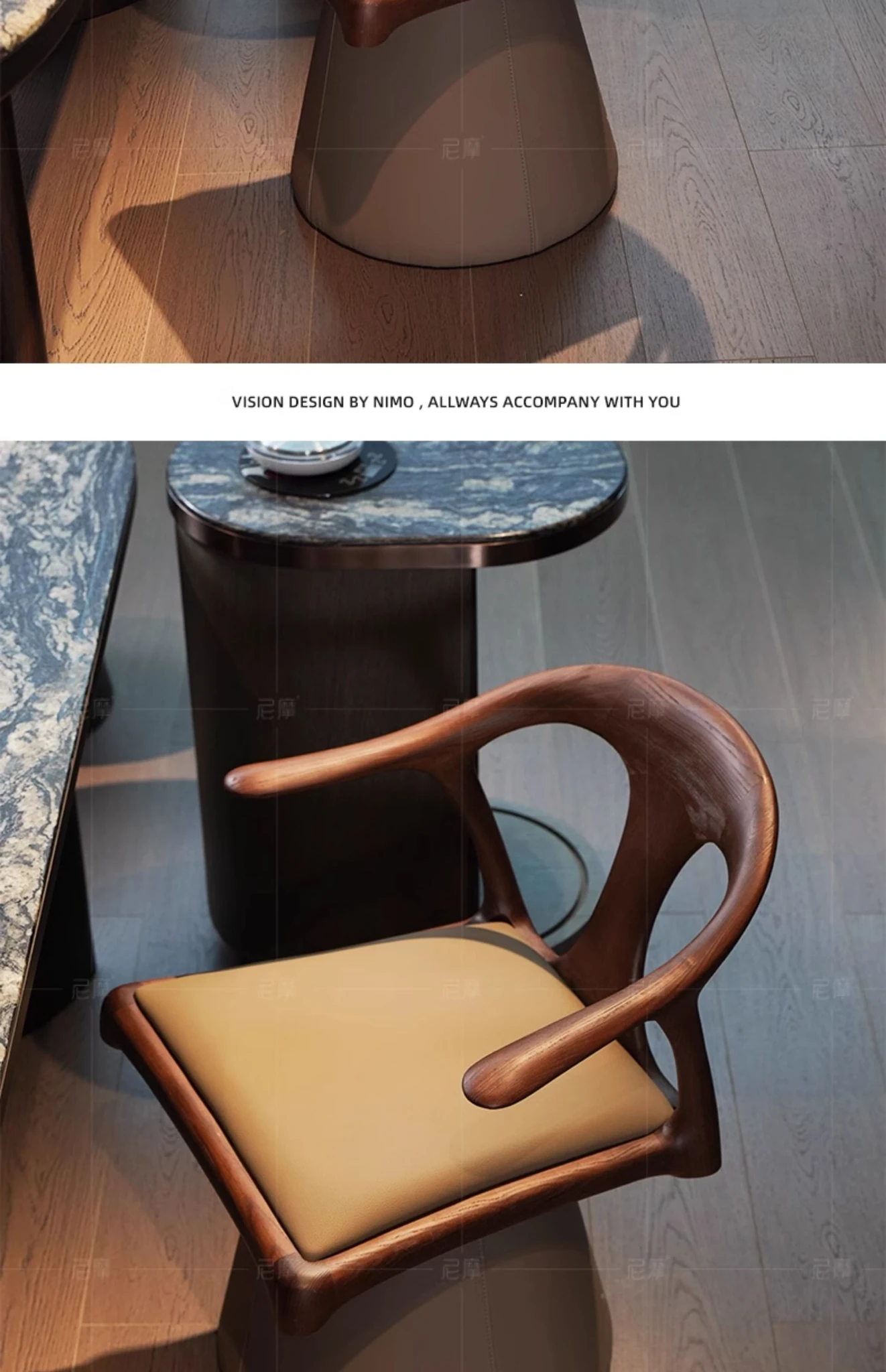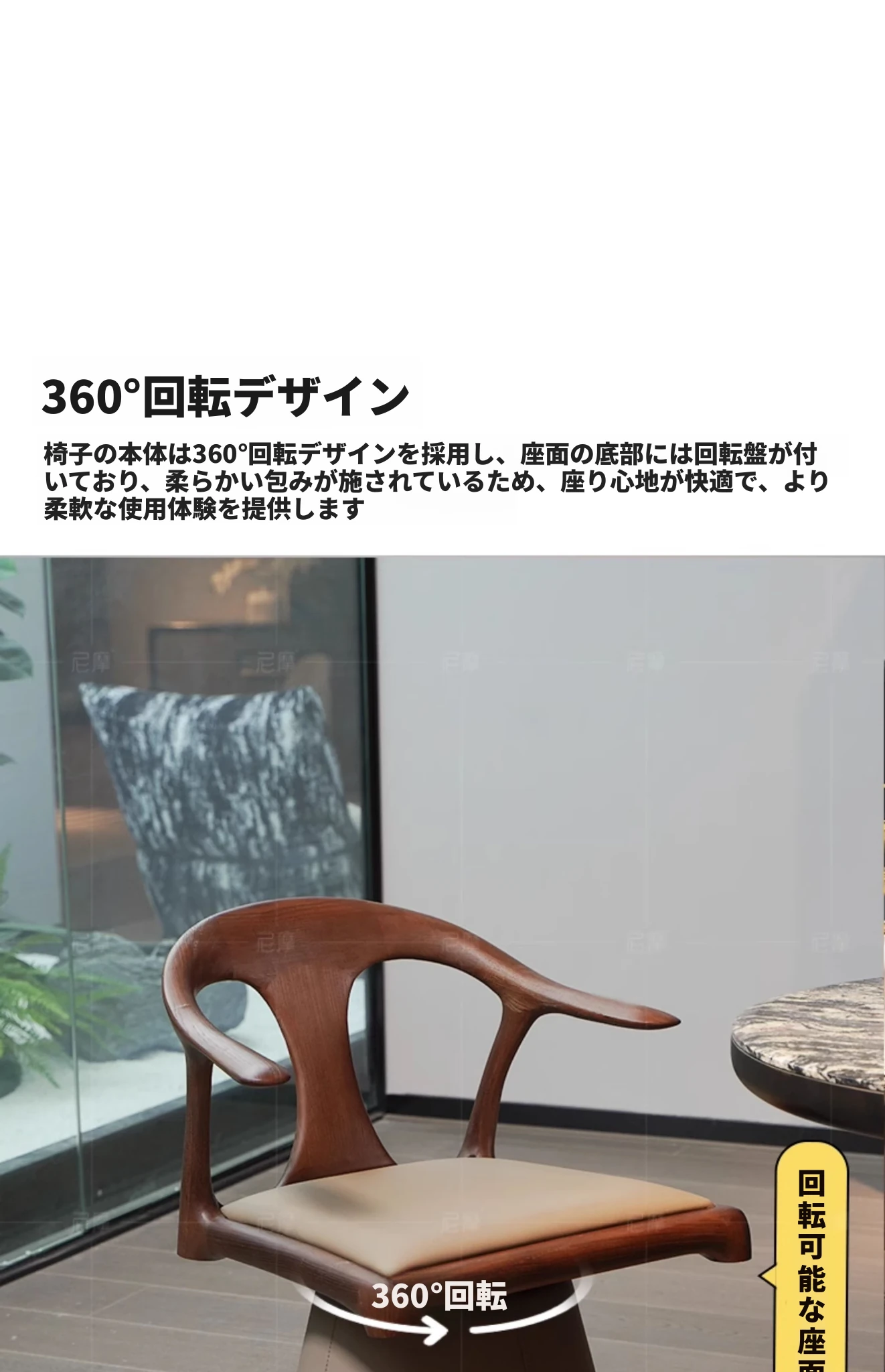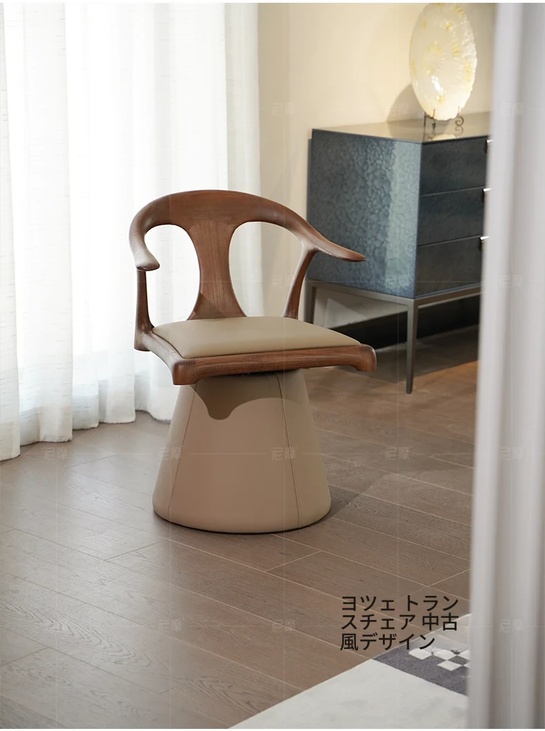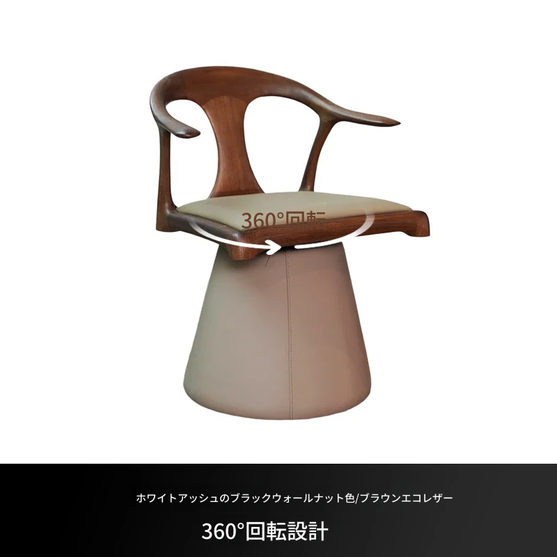 ニモデザイナーの本革回転式ハイバックチェア - ブラックウォールナット製、アンティーク風の無垢材使用、ダイニングやリビングに最適なスタイリッシュなアームチェア。快適さとデザイン性を兼ね備えた一品です。