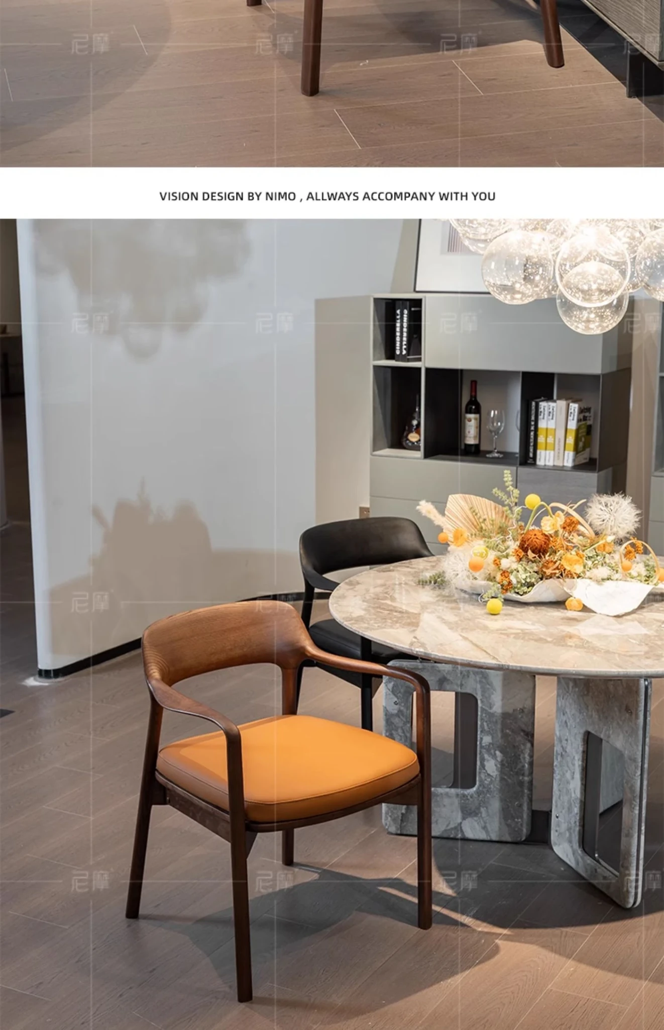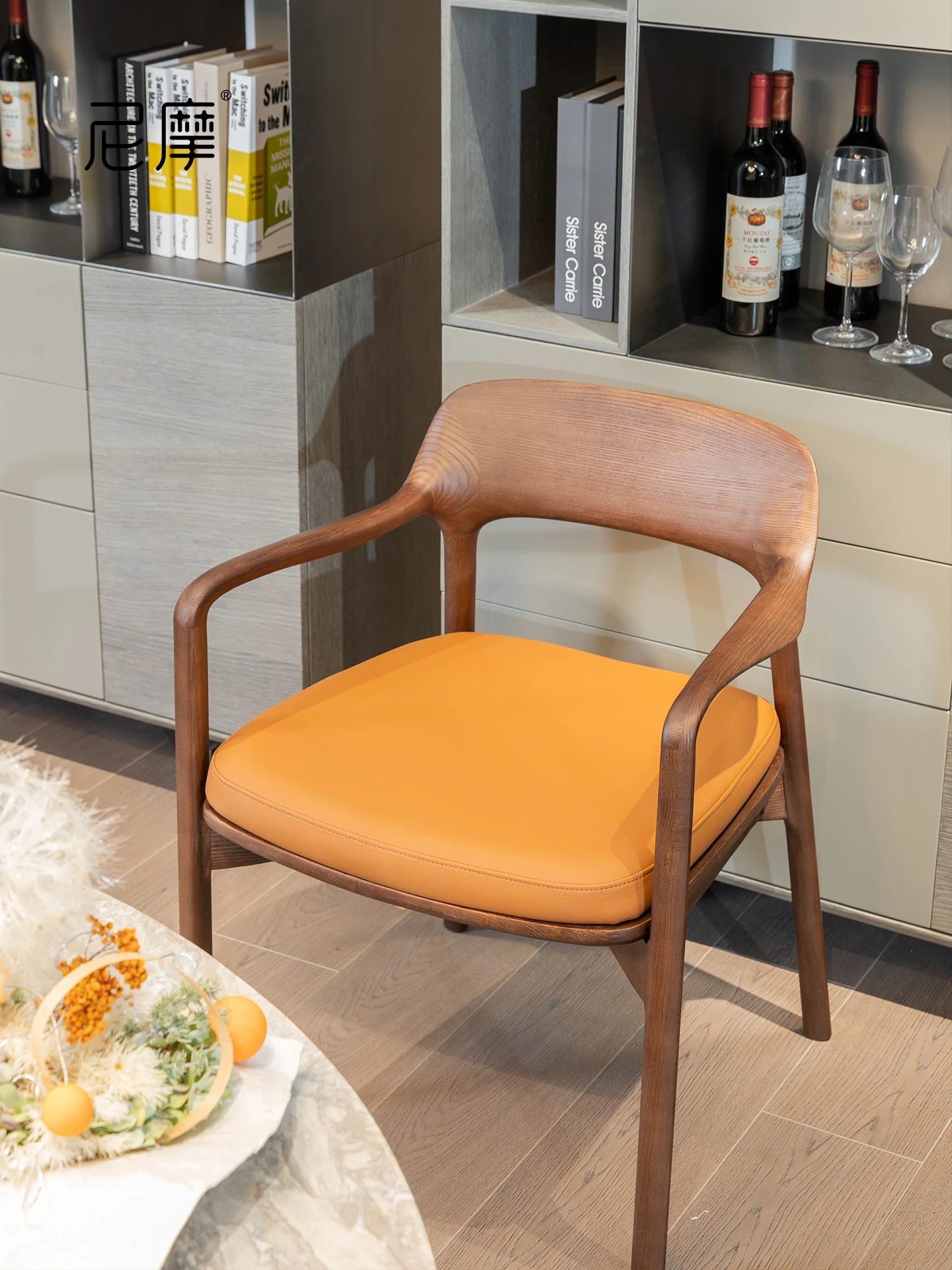 ニモデザインの中古ブラックウォールナット本革ダイニングチェア。アームチェアとしても使える高級感あふれる一品。背もたれ付きで快適な座り心地を実現。おしゃれな主婦の椅子やティーチェア、接客用にも最適!