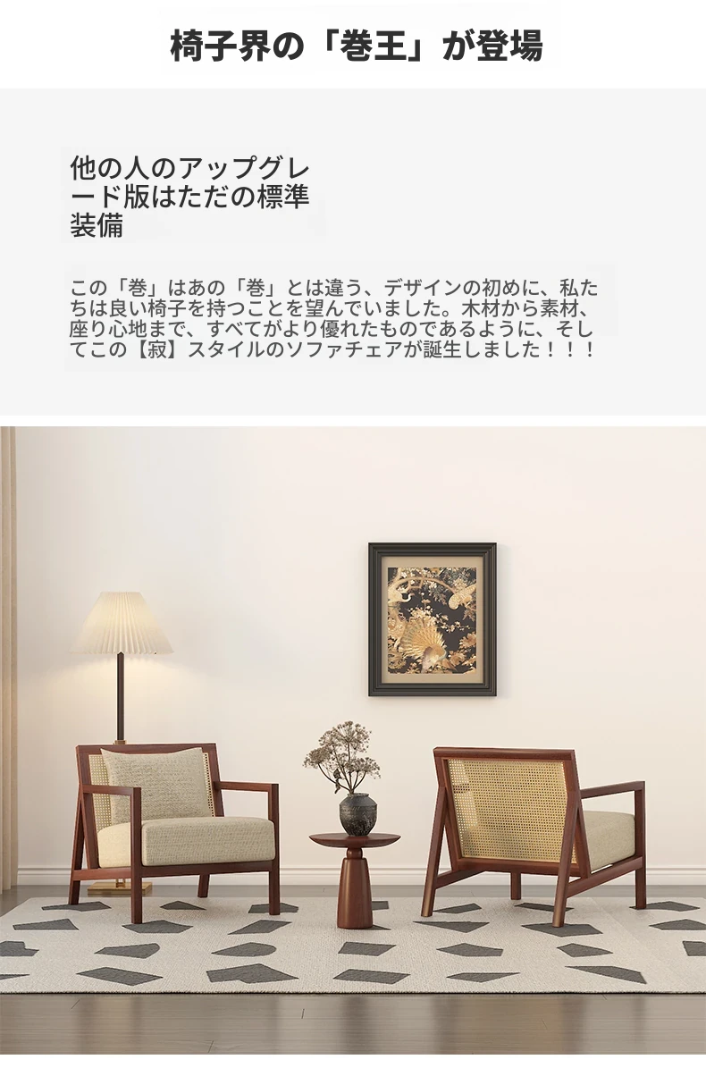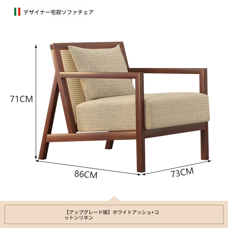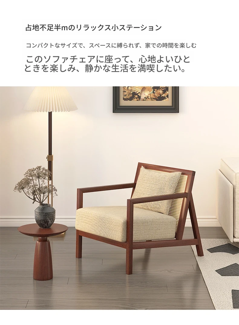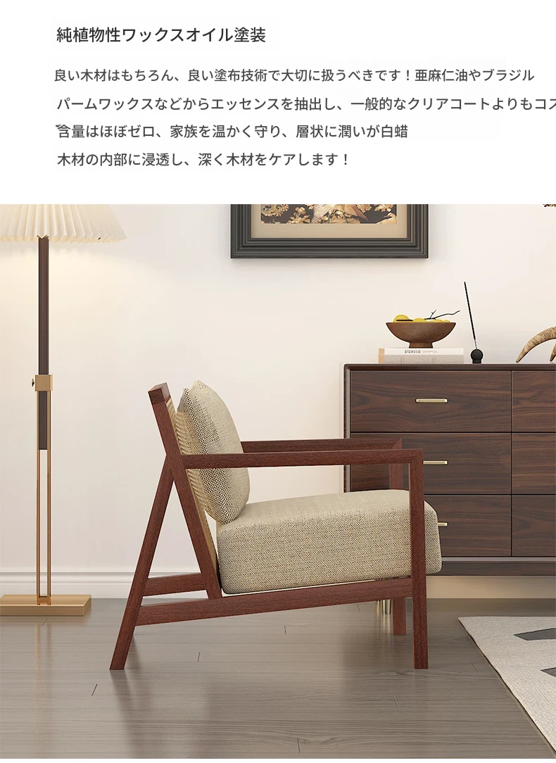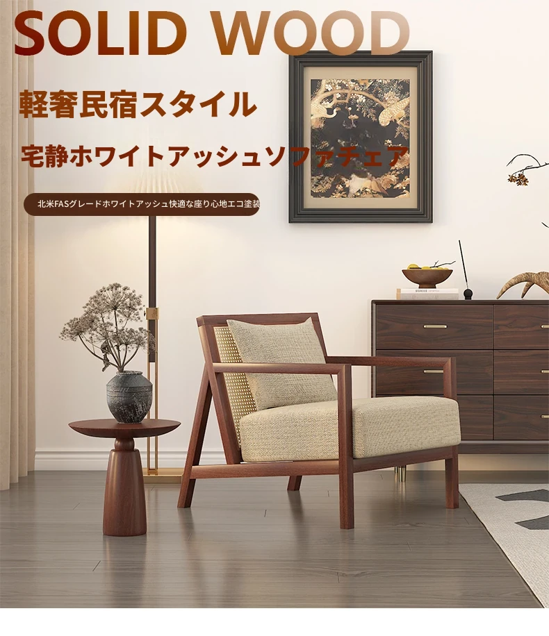 北欧スタイルの無垢材一人掛けソファ - モダンな侘び寂びデザイン、リラックスできるラウンジチェア。ホテルや民宿、サロンの接待にも最適!快適なくつろぎを提供します。