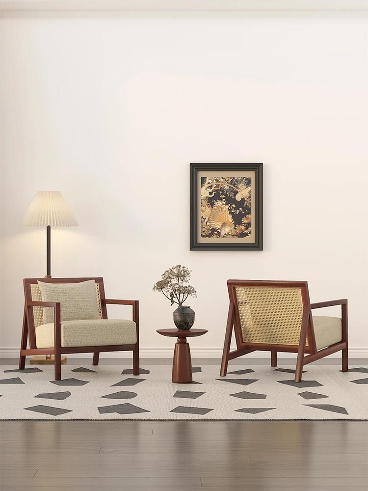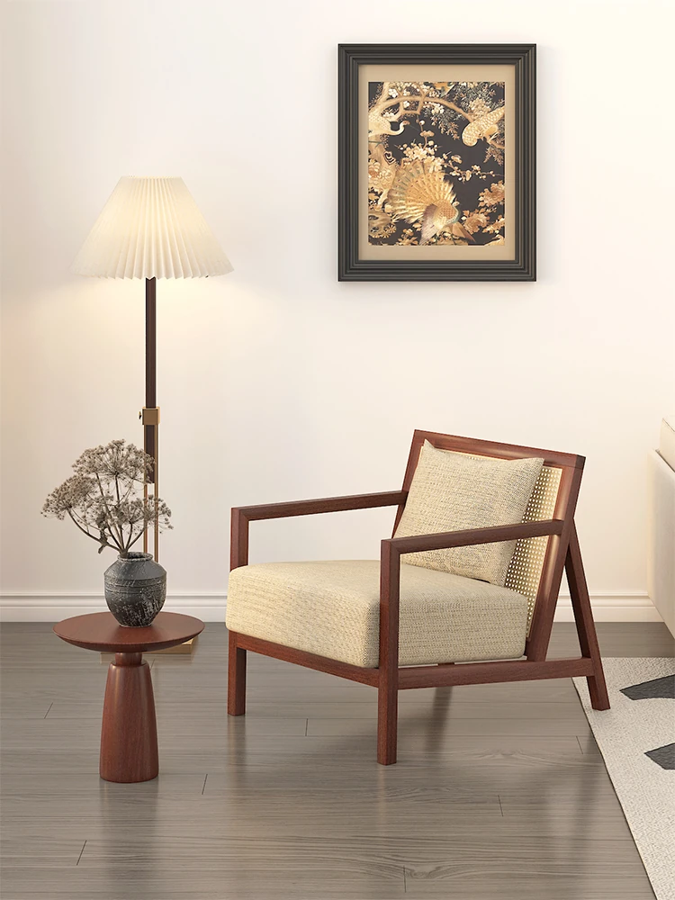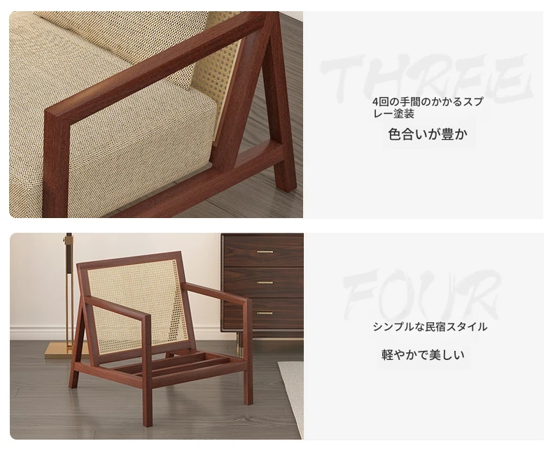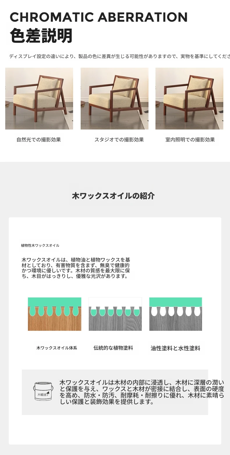 北欧スタイルの無垢材一人掛けソファ - モダンな侘び寂びデザイン、リラックスできるラウンジチェア。ホテルや民宿、サロンの接待にも最適!快適なくつろぎを提供します。