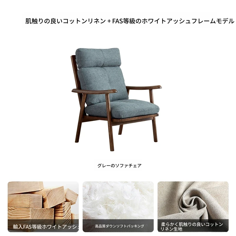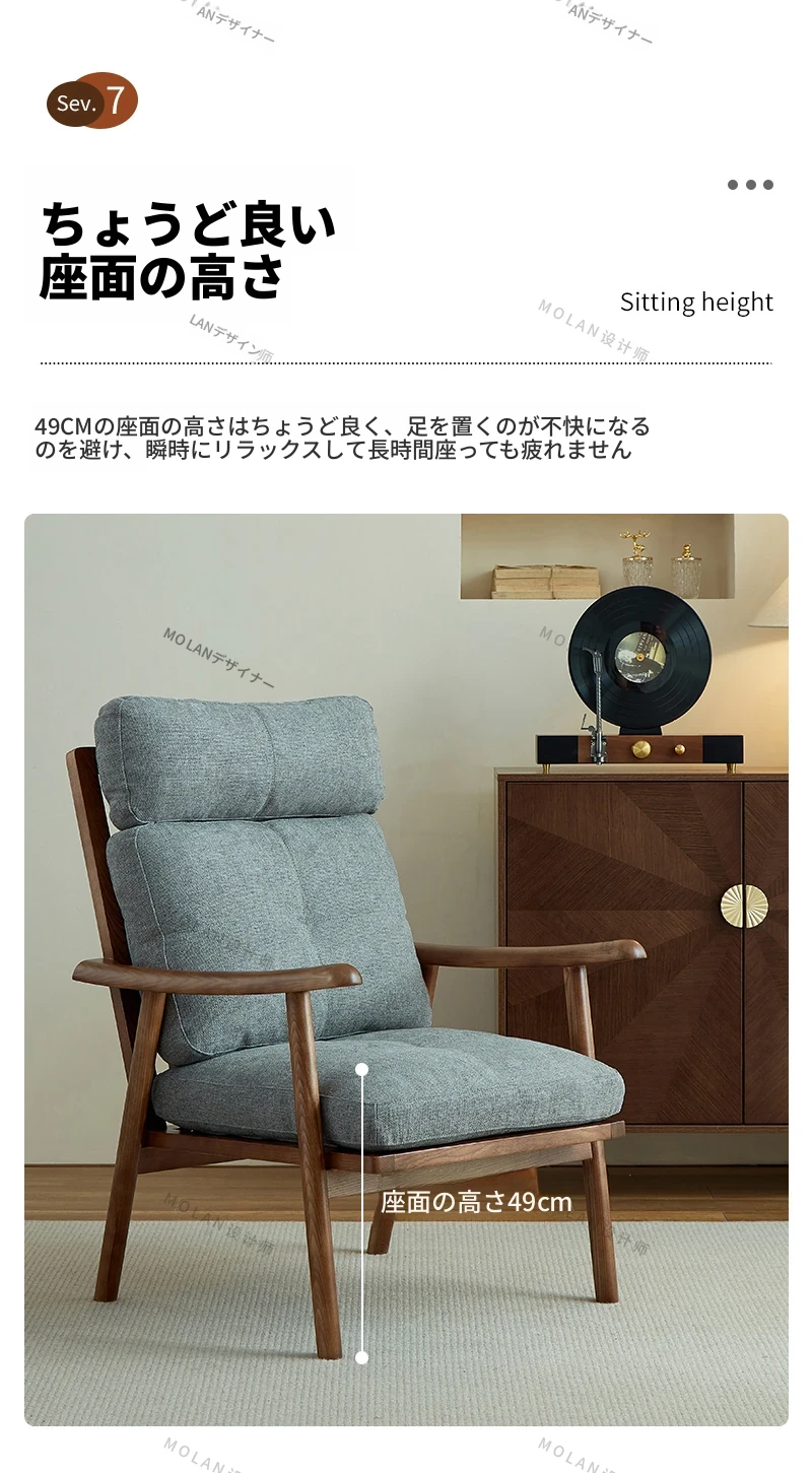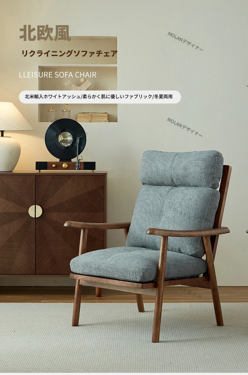北欧デザインの無垢材とファブリックを使用したリラックスチェア - おしゃれな一人掛けソファ、リビングやバルコニーに最適なトレンドアイテム!快適な頭部サポート付きで、心地よいひとときをお楽しみください。