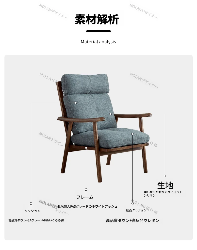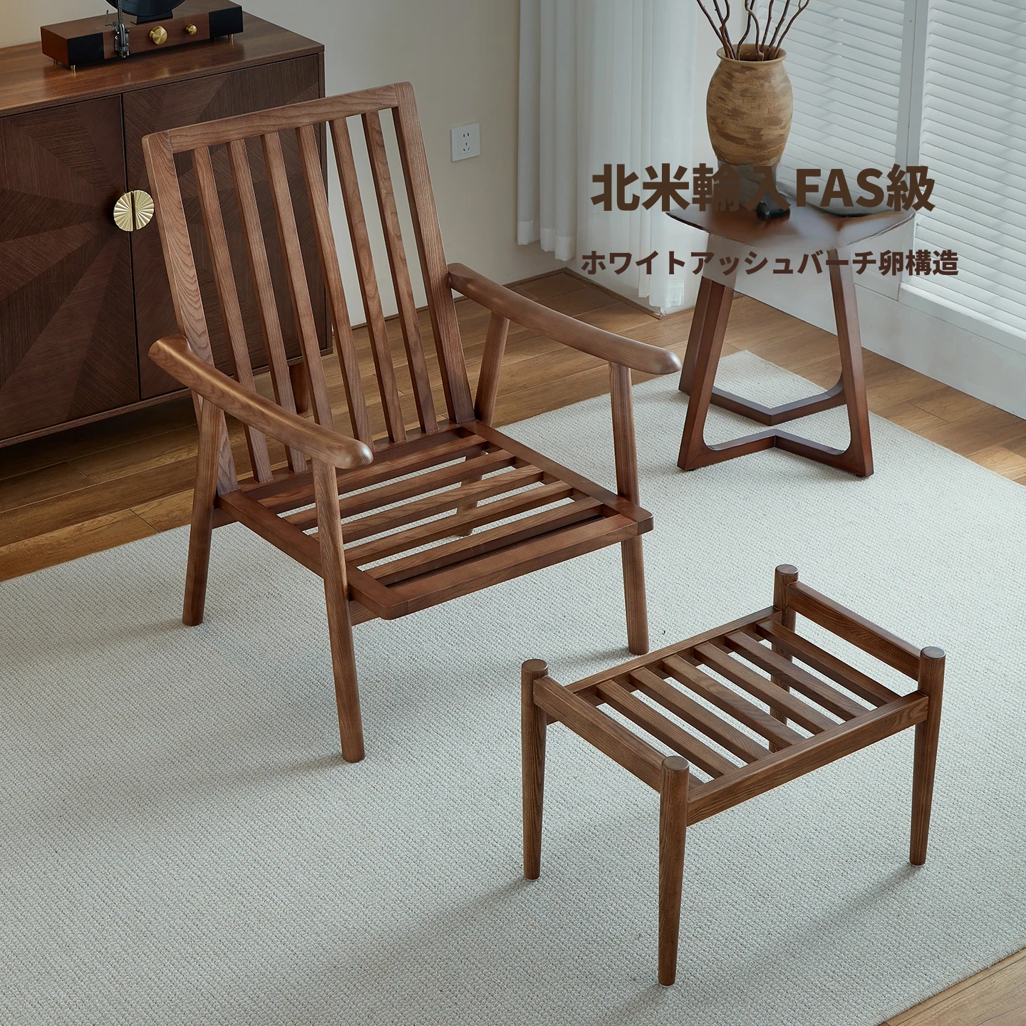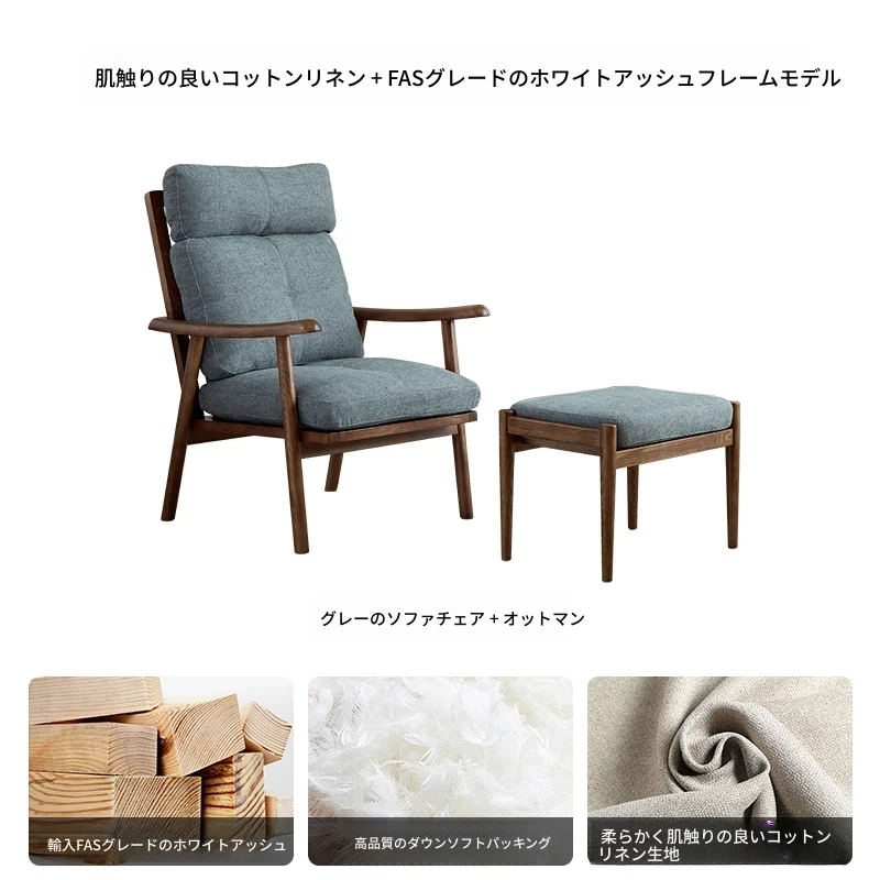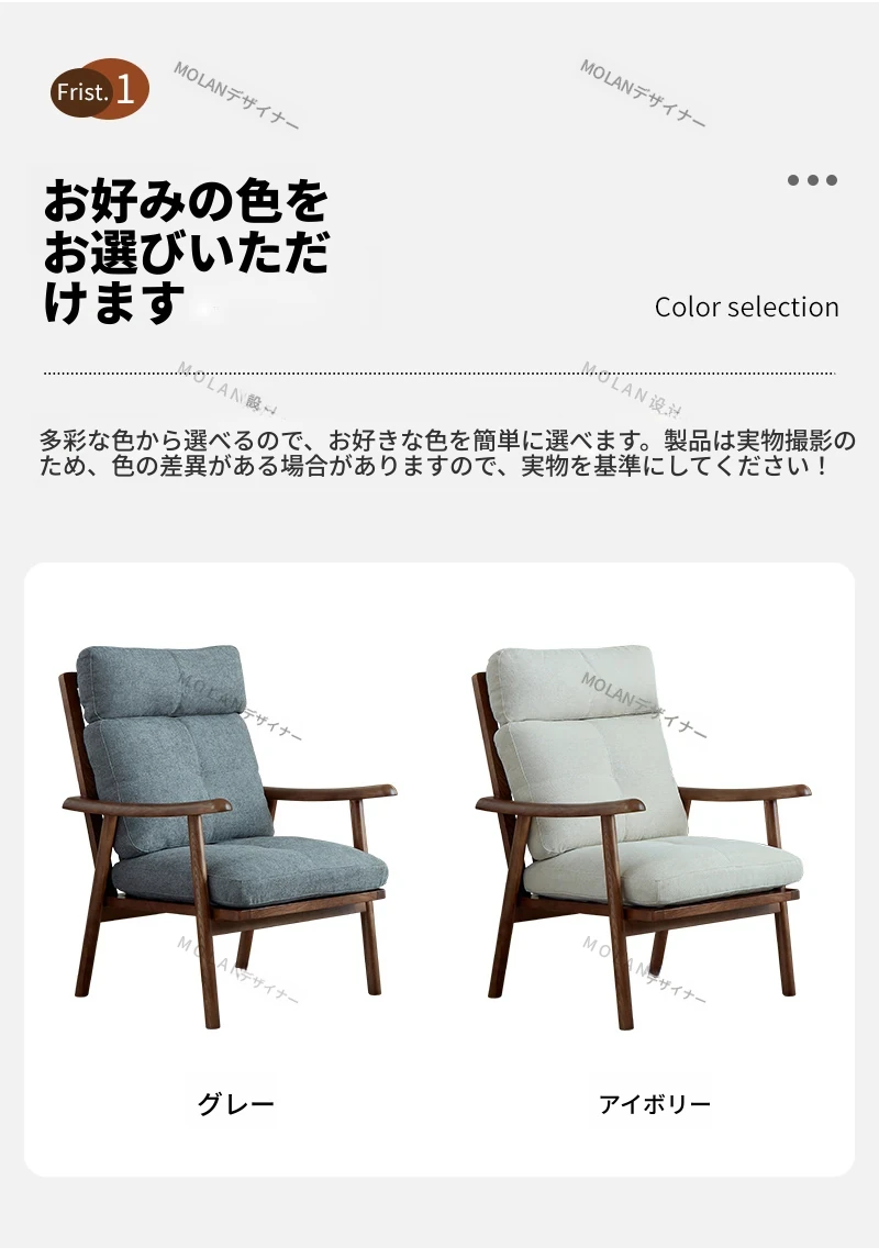 北欧デザインの無垢材とファブリックを使用したリラックスチェア - おしゃれな一人掛けソファ、リビングやバルコニーに最適なトレンドアイテム!快適な頭部サポート付きで、心地よいひとときをお楽しみください。