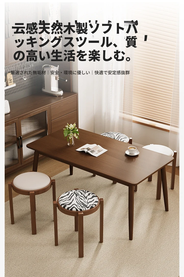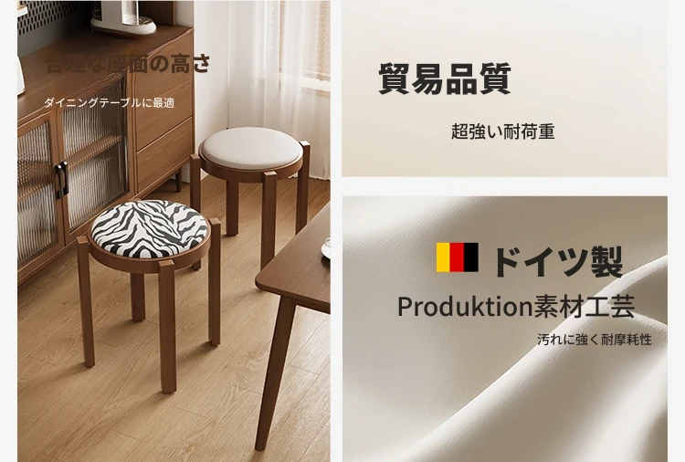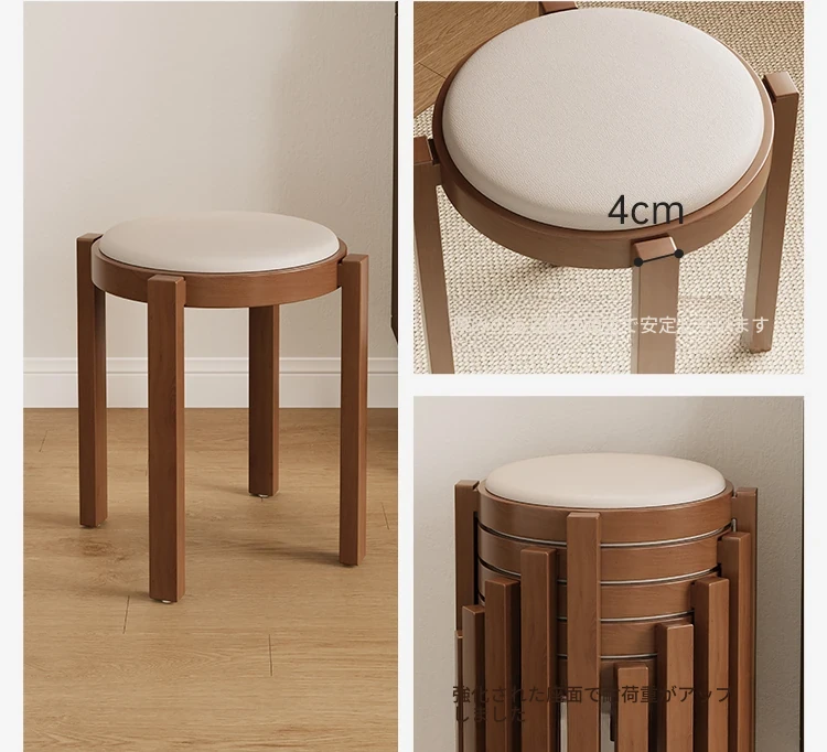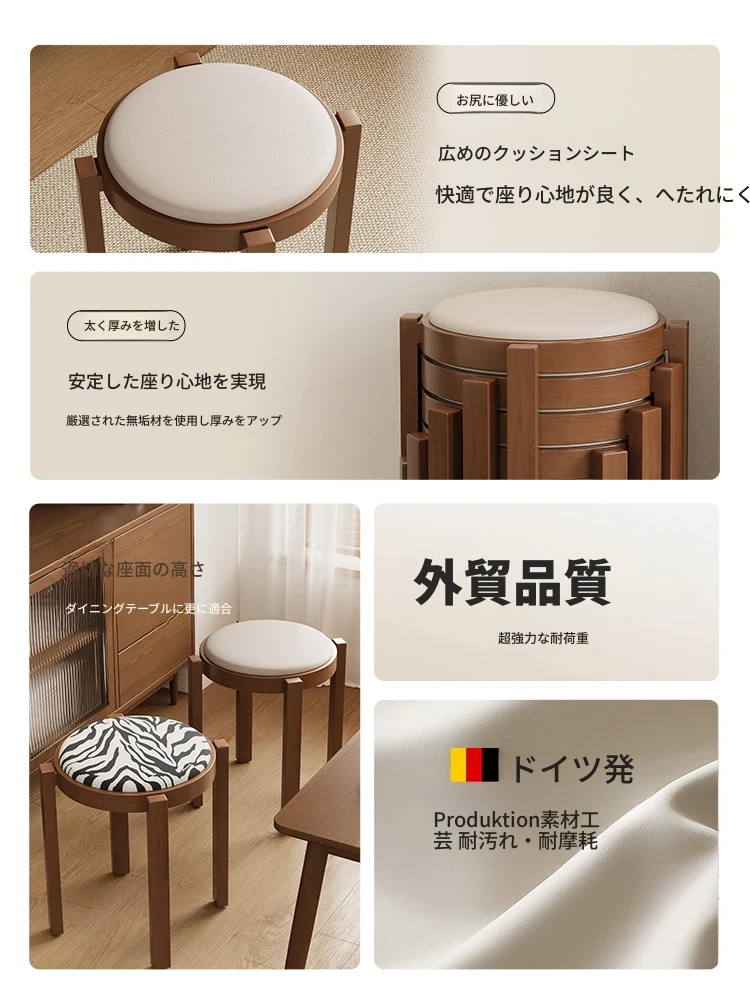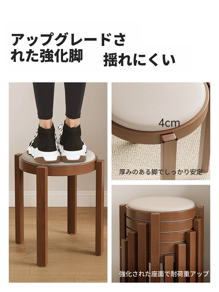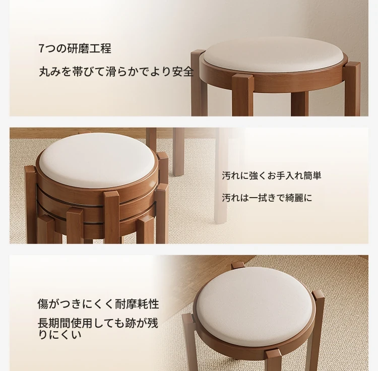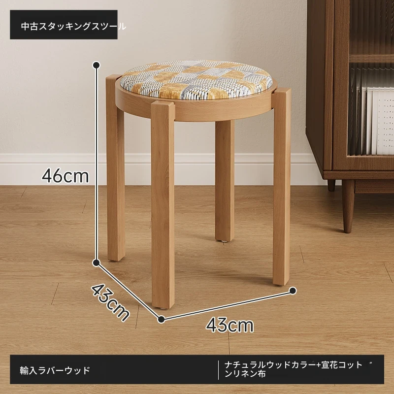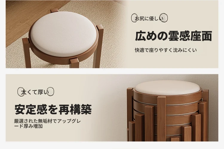 高級感溢れる実木製スタッキングソファー、柔らかいクッション付きの丸型スツール。リビングやダイニングに最適な、来客時にも便利なスタイリッシュなサブスツール。