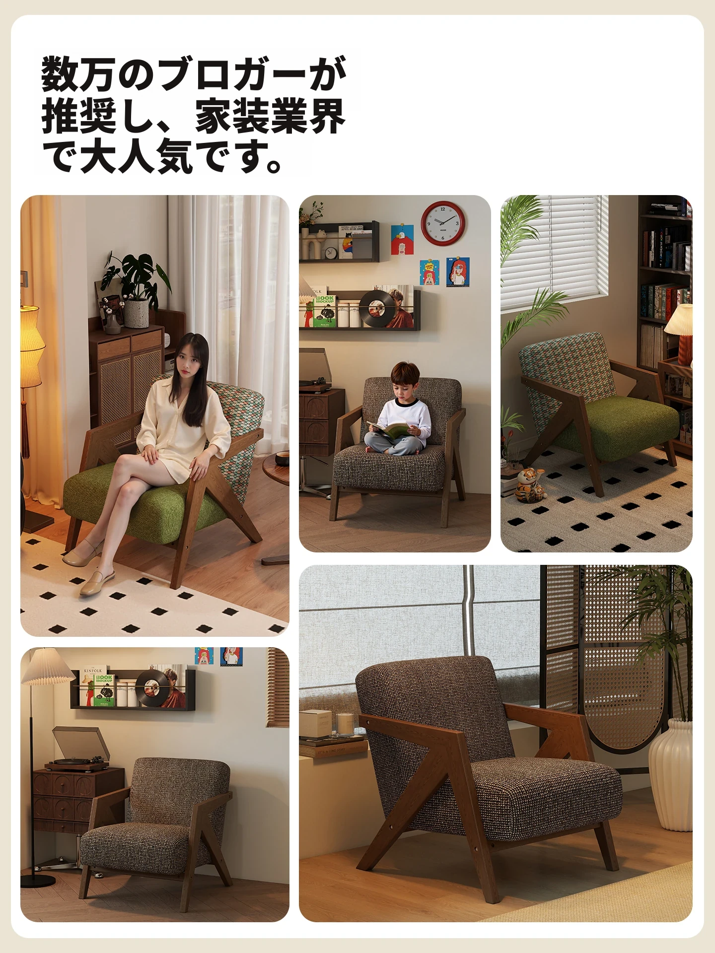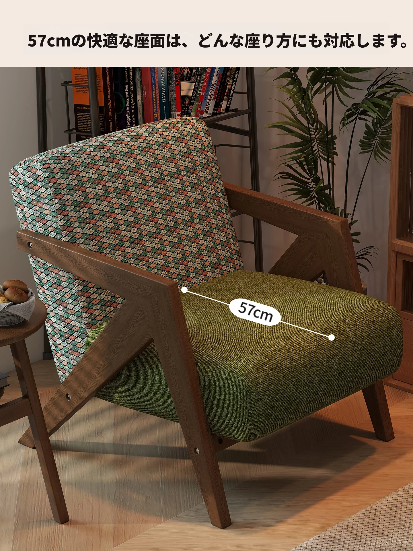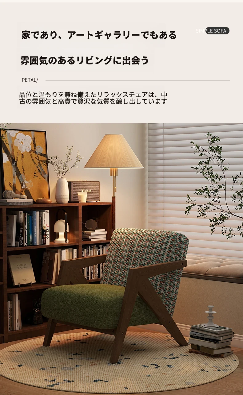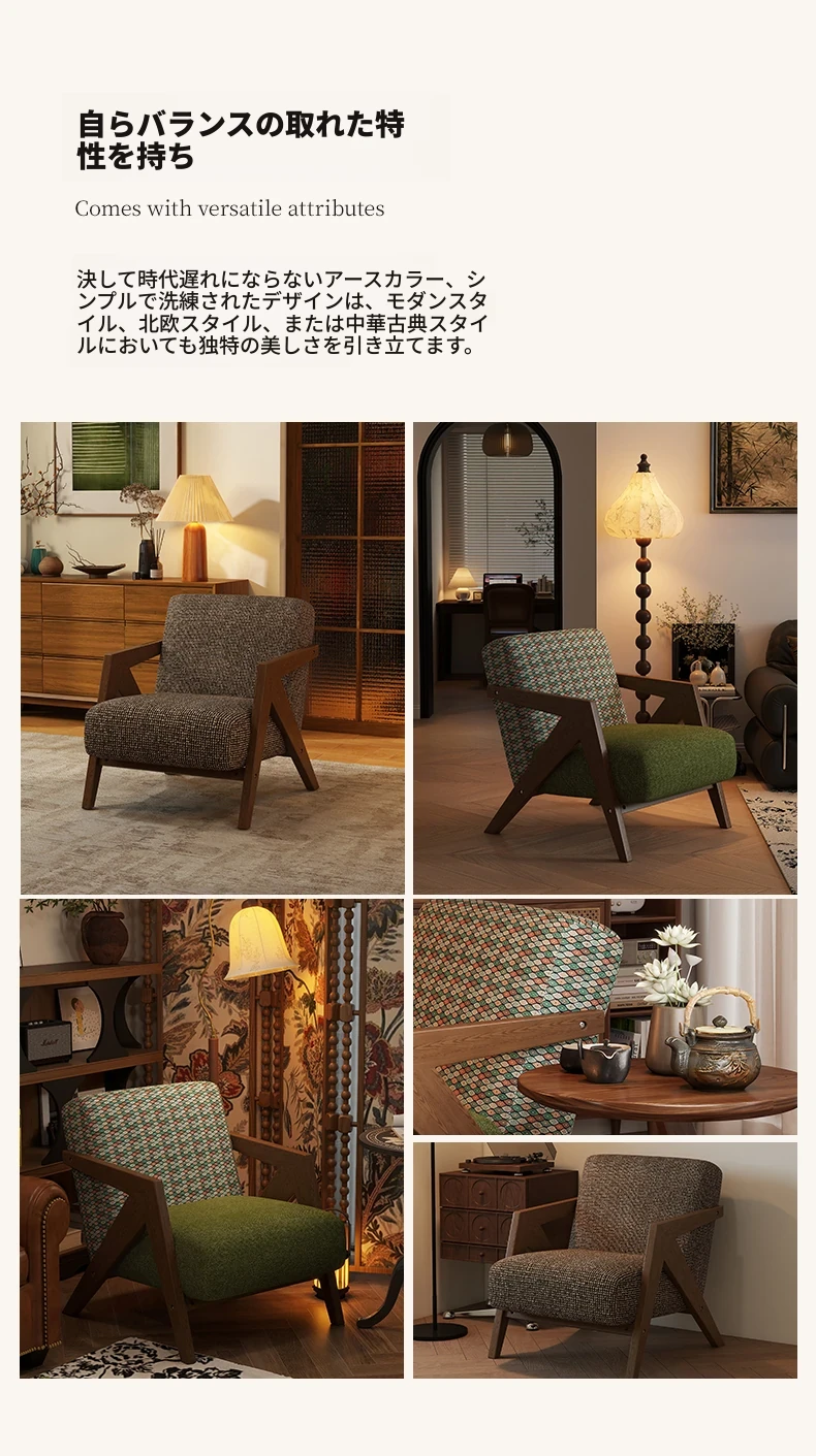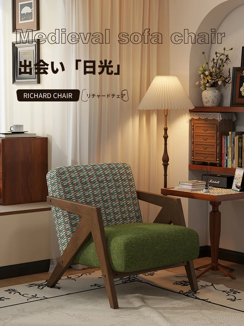 リチャード・フレンチスタイルの一人掛けソファチェア|中古風おしゃれなリビング・バルコニー用リラックスチェア|高品質無垢材使用|ホテルや宿泊施設にも最適なデザイン