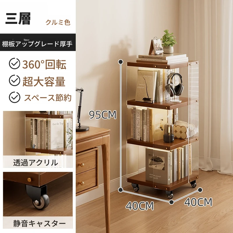 【HD透明】 三層-ウォールナット色 (360度回転) 移動可能
