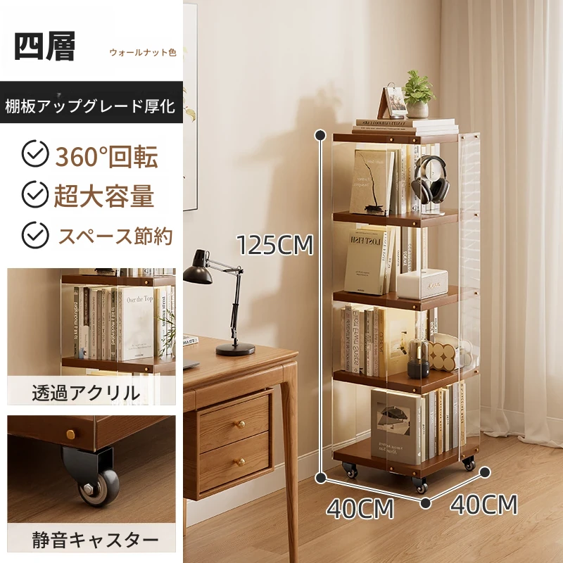 【HD透明】 四層-ウォールナット色 (360度回転) 移動可能