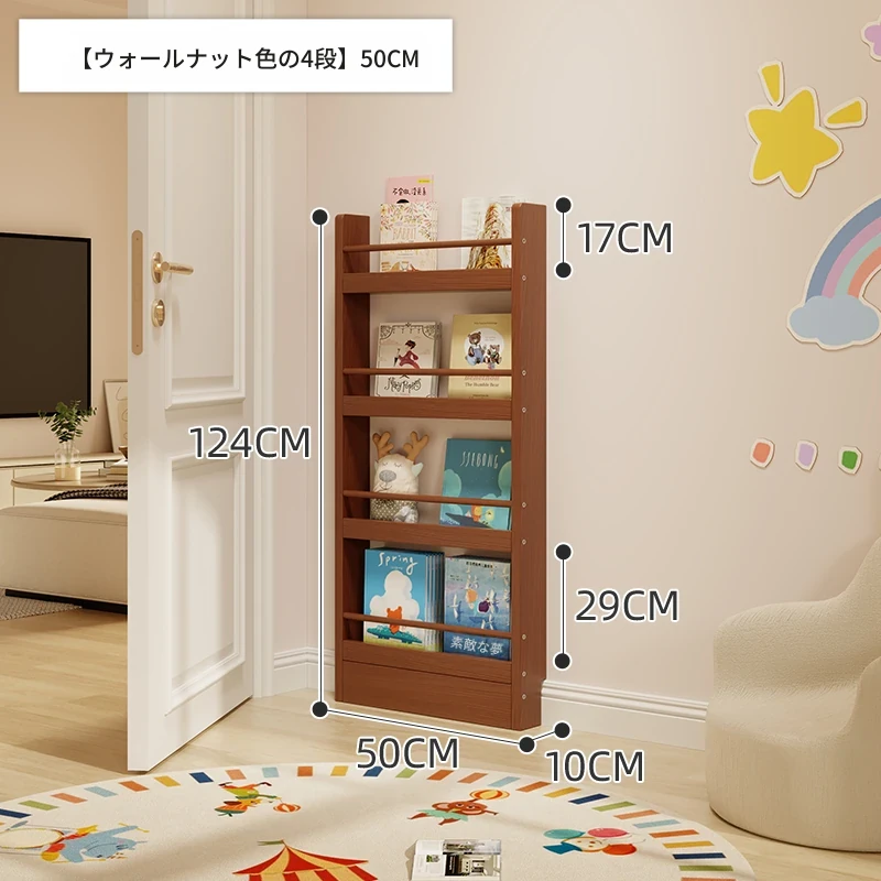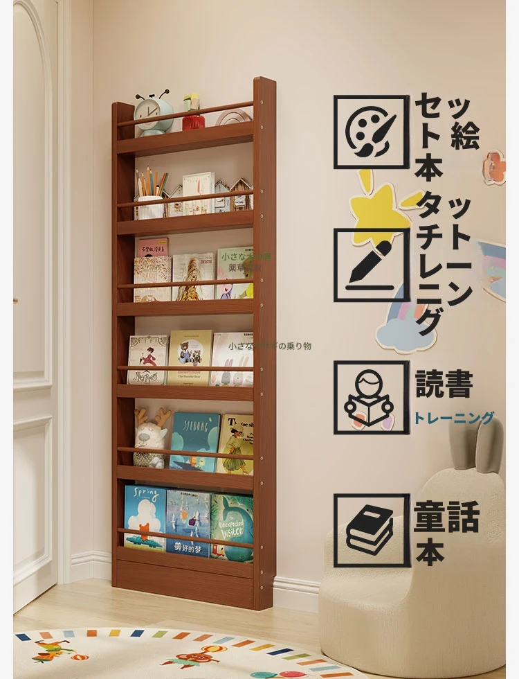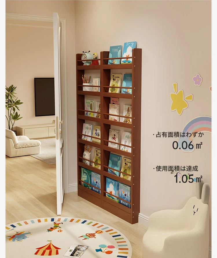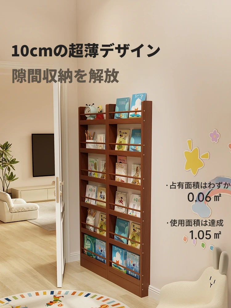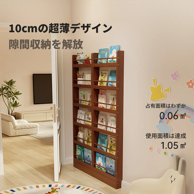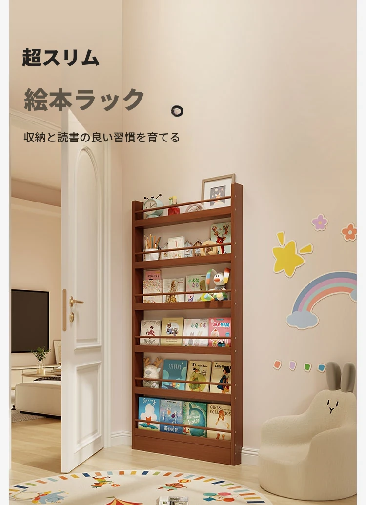超薄デザインの子供向け絵本ラック!壁際にぴったりフィットするスリムな収納キャビネット。ドアの後ろにも置ける省スペース型のフロアシェルフで、お部屋をスッキリ整理!おしゃれで機能的な収納を実現します!