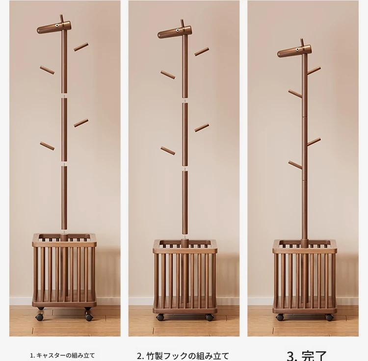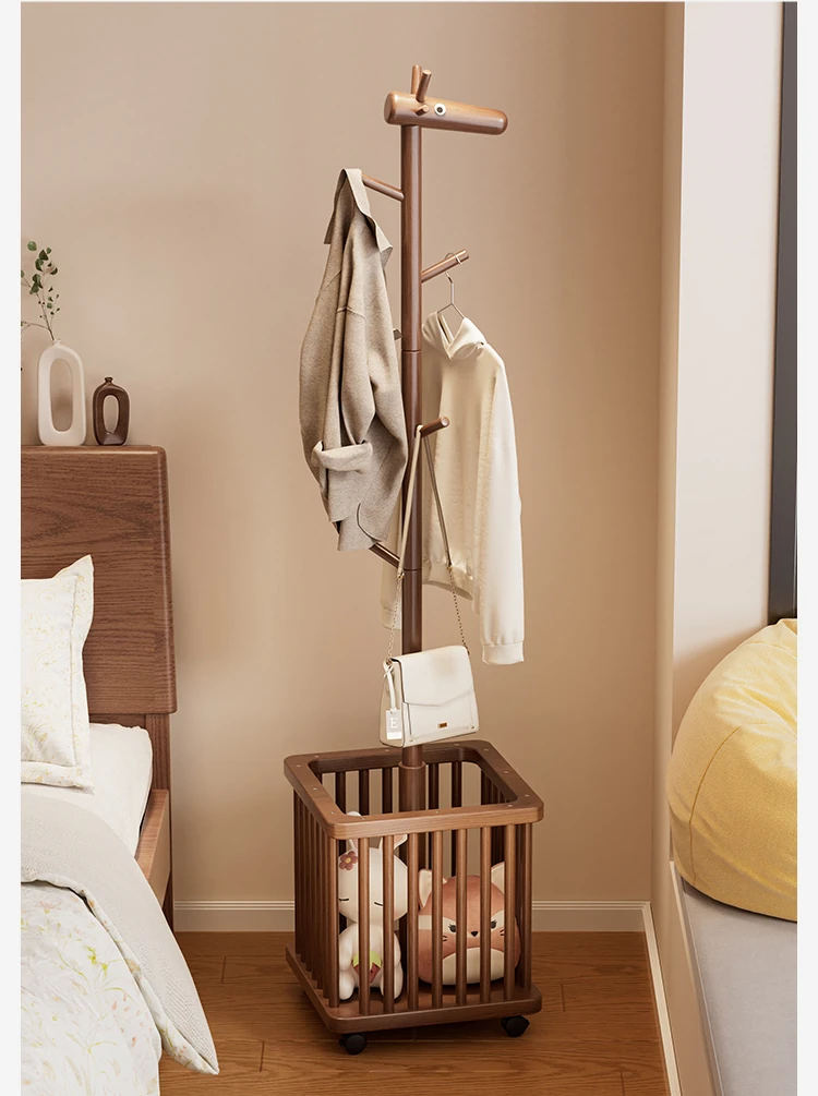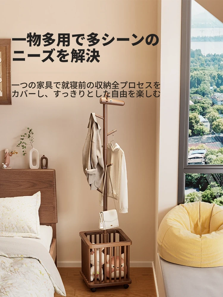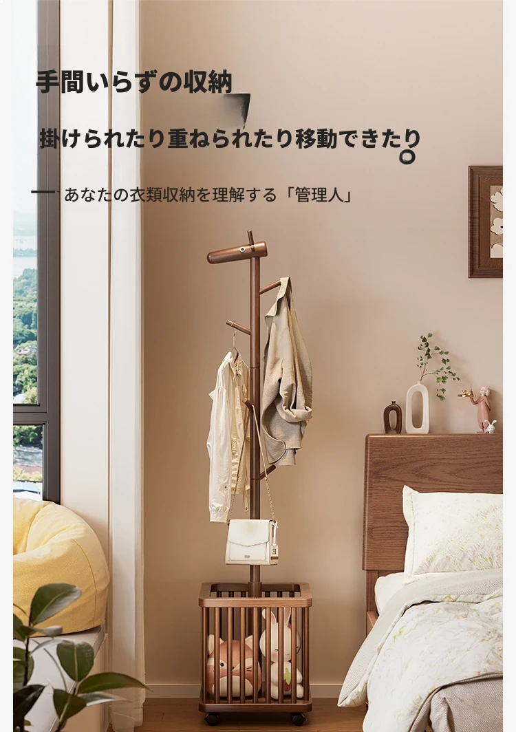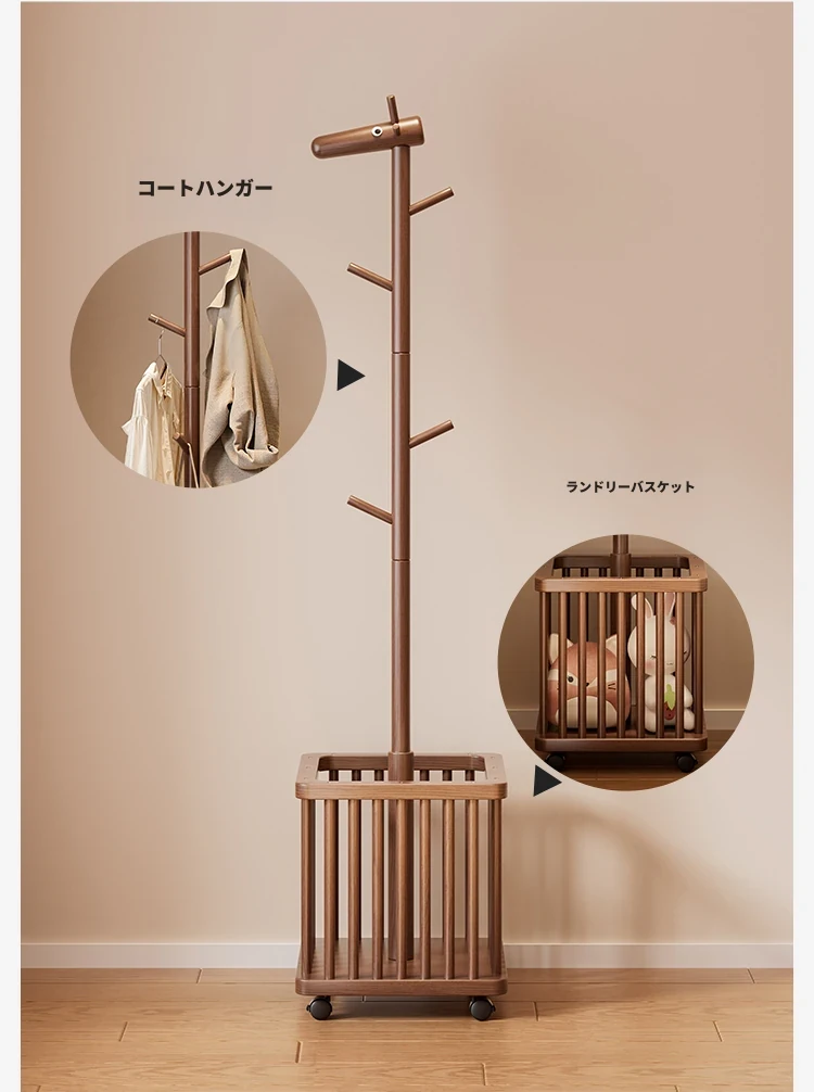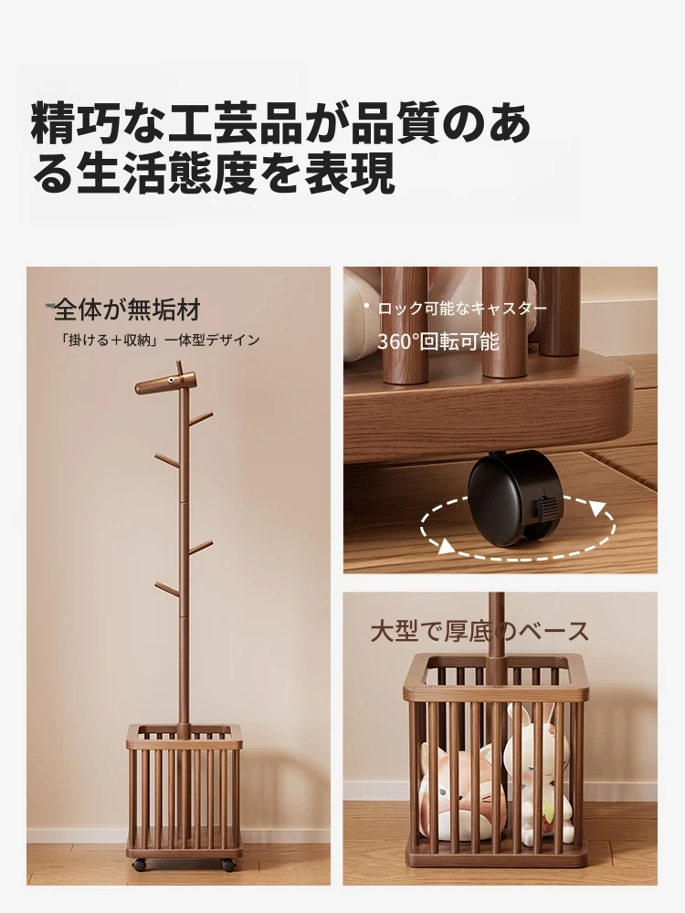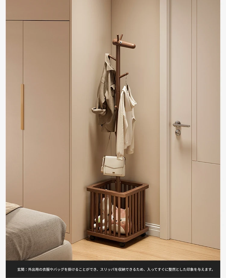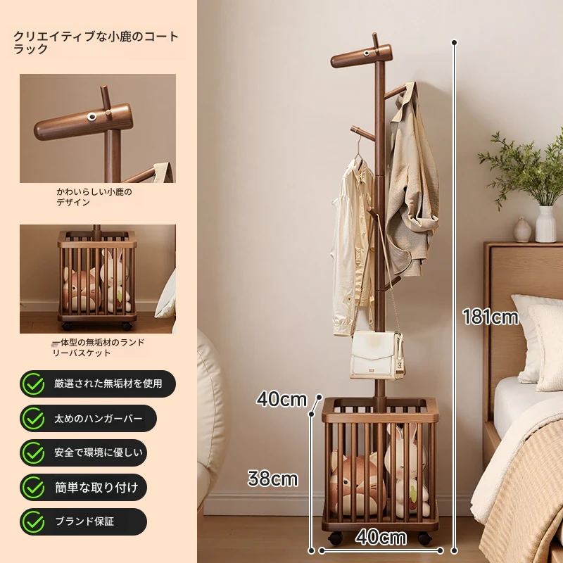 天然木製の小鹿型コートハンガー - 移動式で寝室やリビングにぴったり!おしゃれなデザインで、子供用の帽子や服をスッキリ収納。使わない時は脱衣かごとしても活躍!お部屋を可愛く演出するアイテムです。