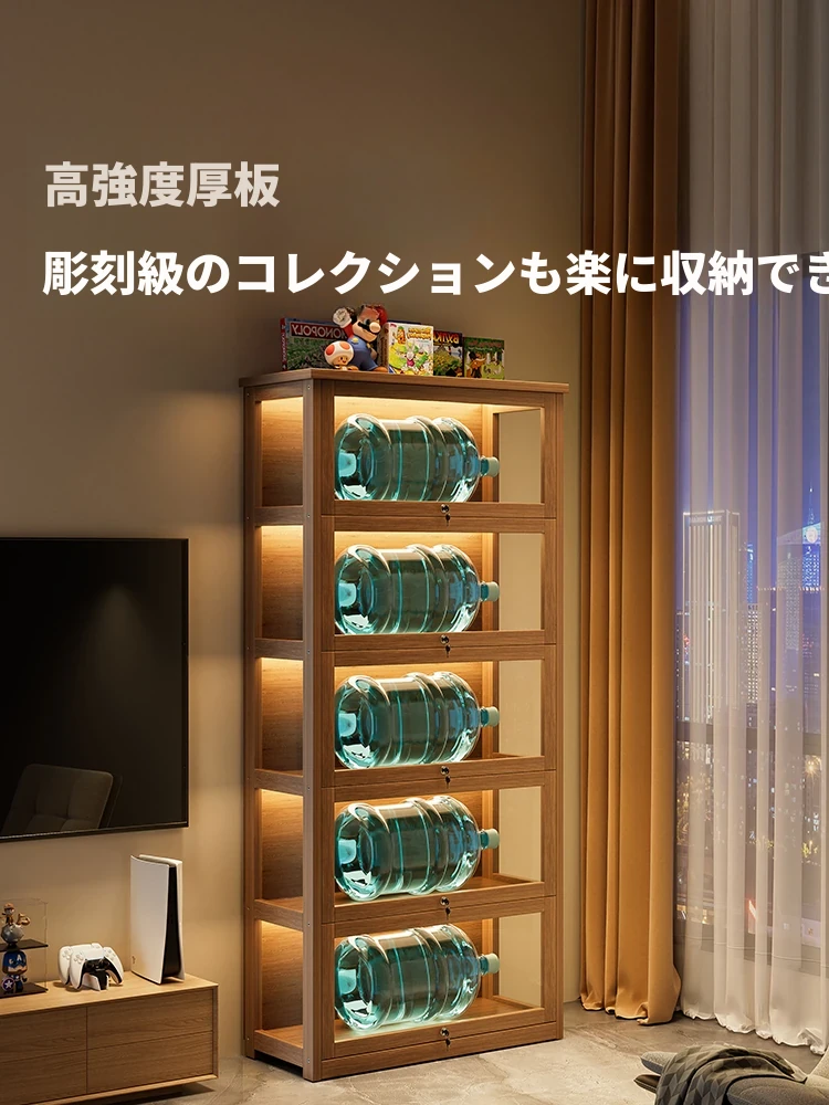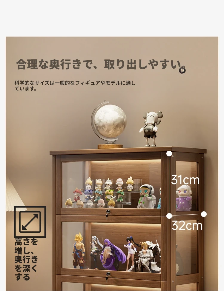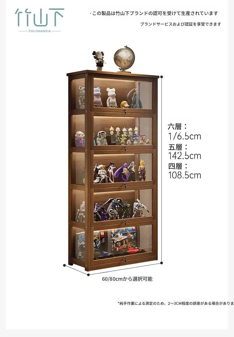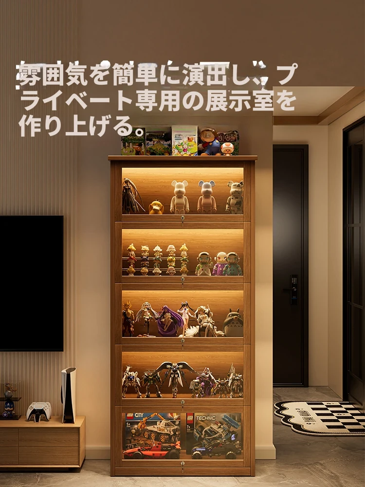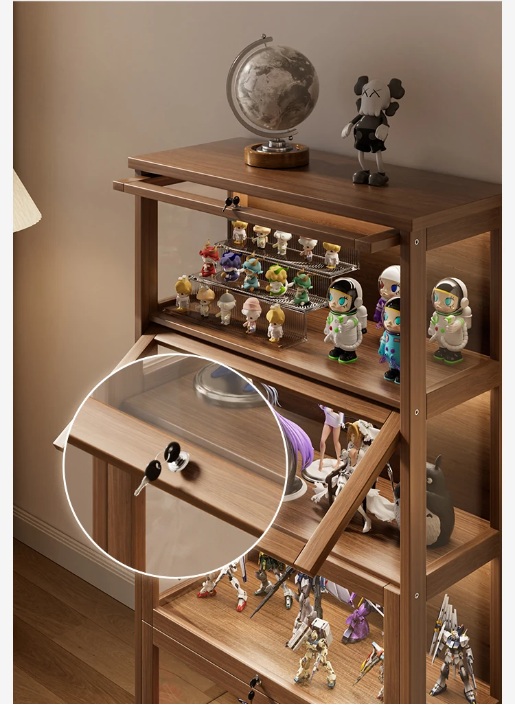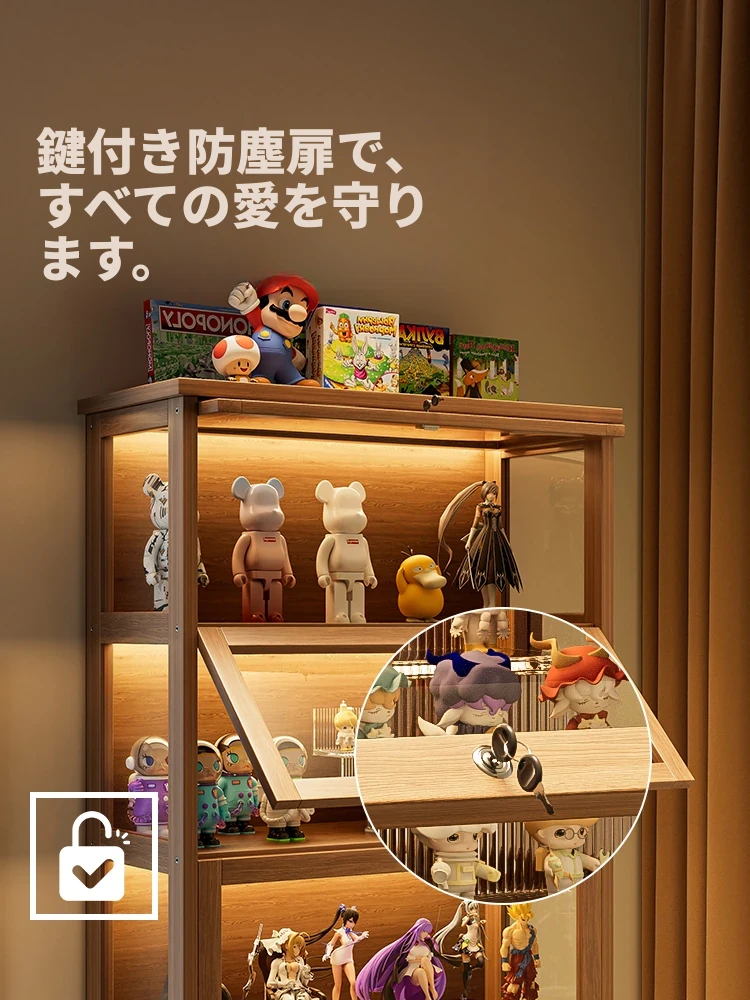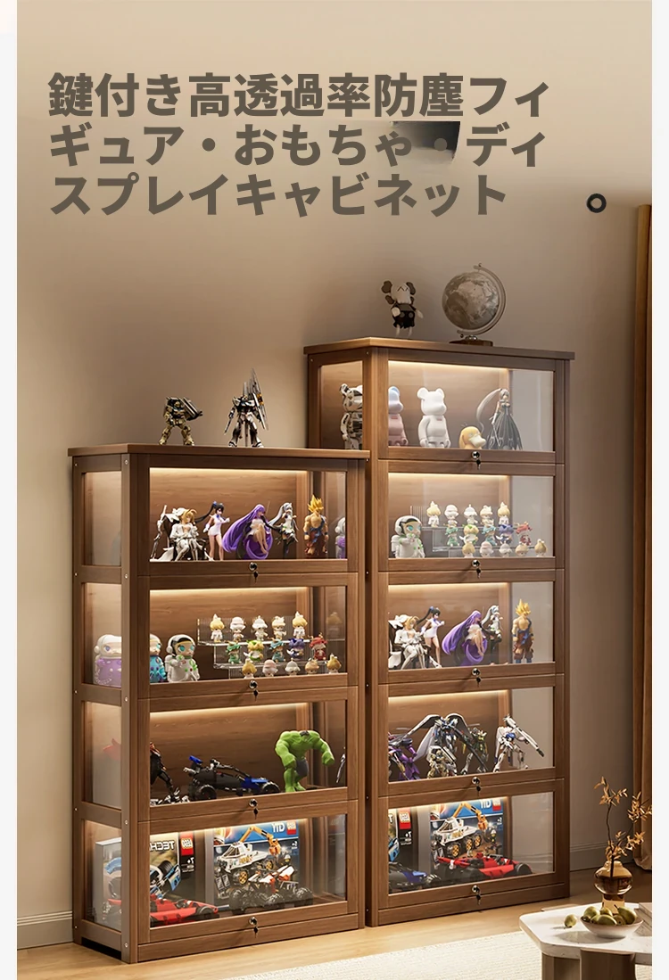 ロック付き無垢材フィギュアキャビネット - 全透明アクリルディスプレイケース、モデルおもちゃの収納、スタンド型インテリアの必需品!おしゃれで安全にあなたのコレクションを美しく展示!