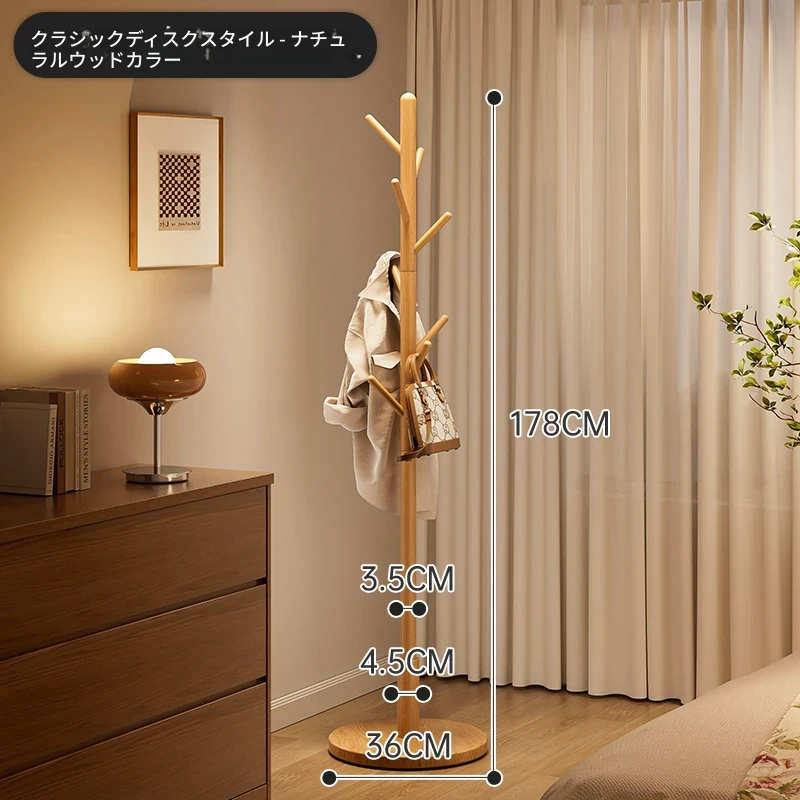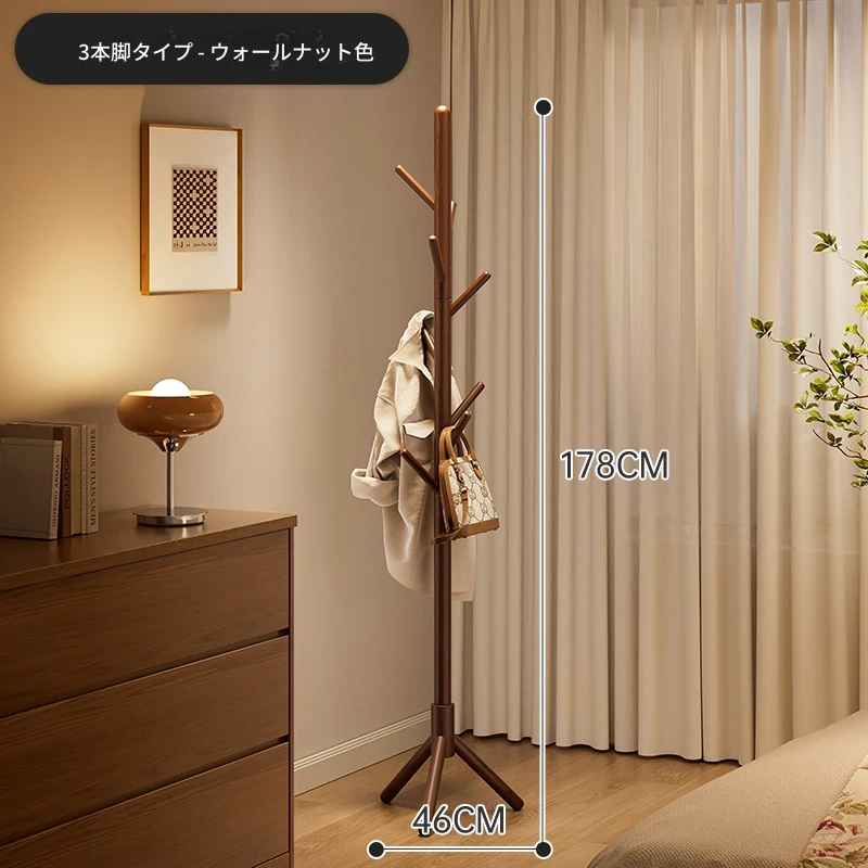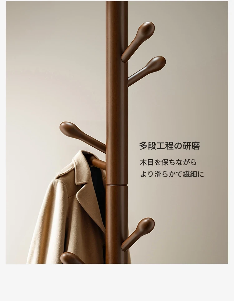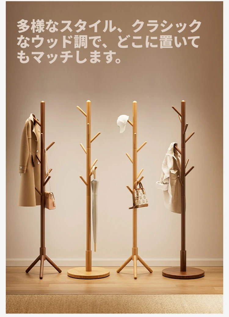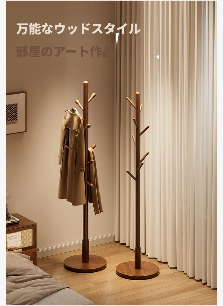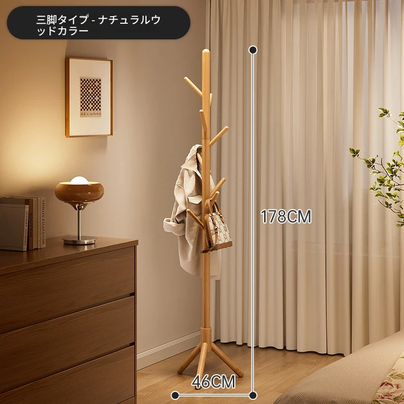天然木製のスタイリッシュなハンガーラック - ベッドサイドや玄関にぴったり!省スペース設計で、シンプルながらもおしゃれな衣類収納を実現。あなたの生活空間を整える必需品です。