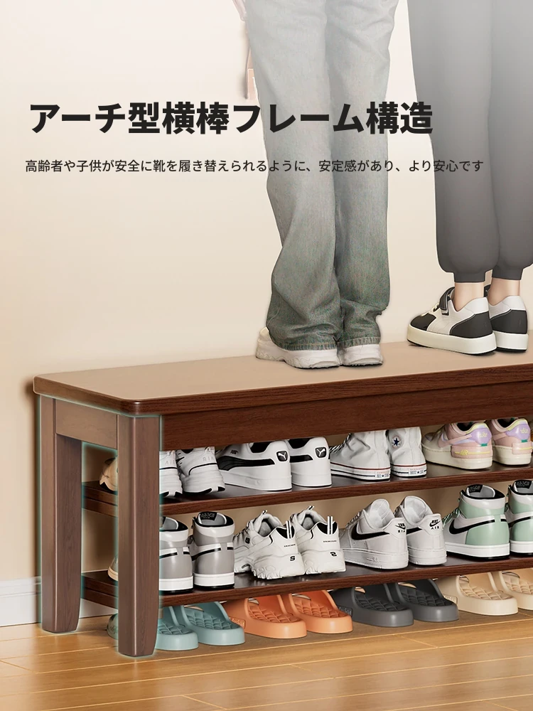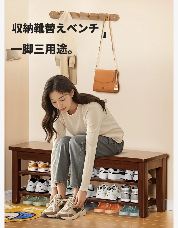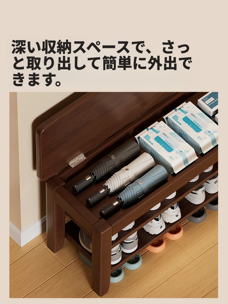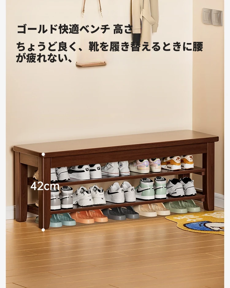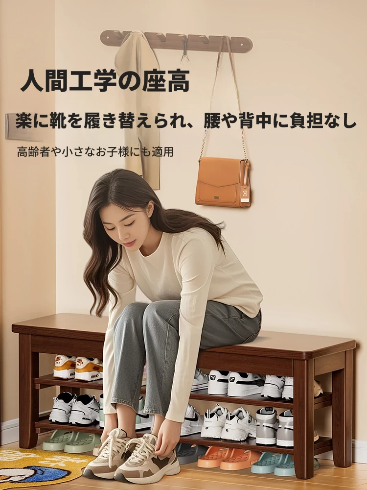 玄関の狭いスペースにぴったり!実木製の靴置き台、座れる靴収納キャビネット一体型で、スマートに収納。おしゃれで機能的なスリムデザインが玄関を彩ります。