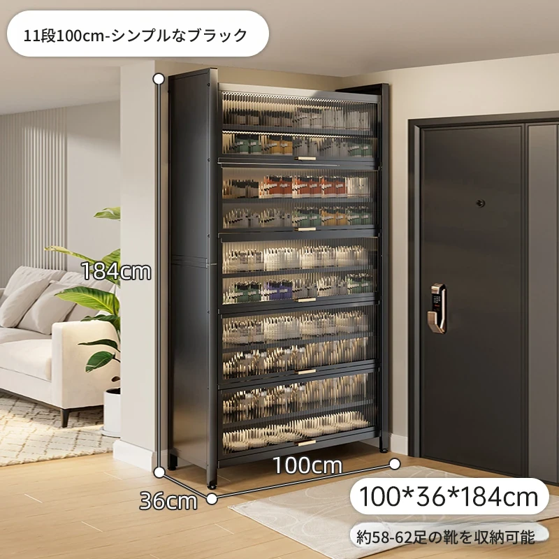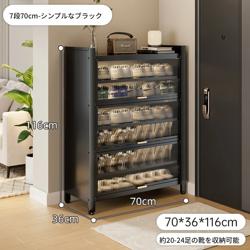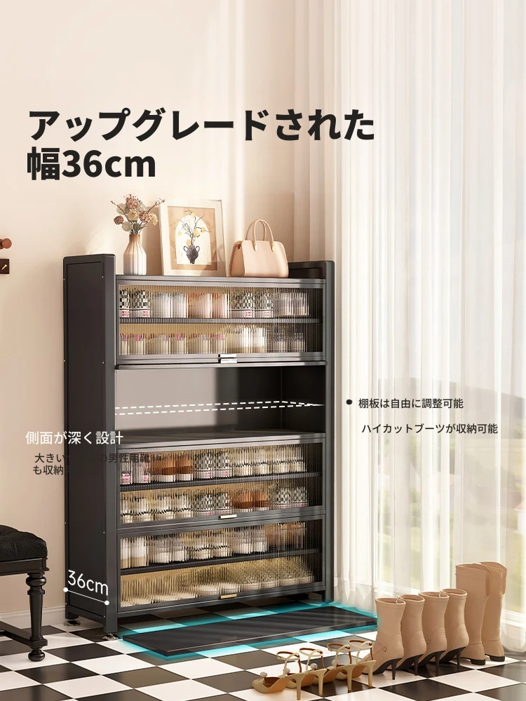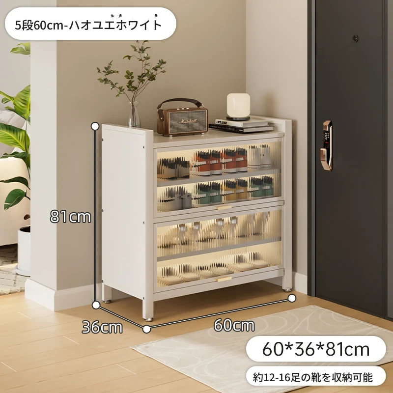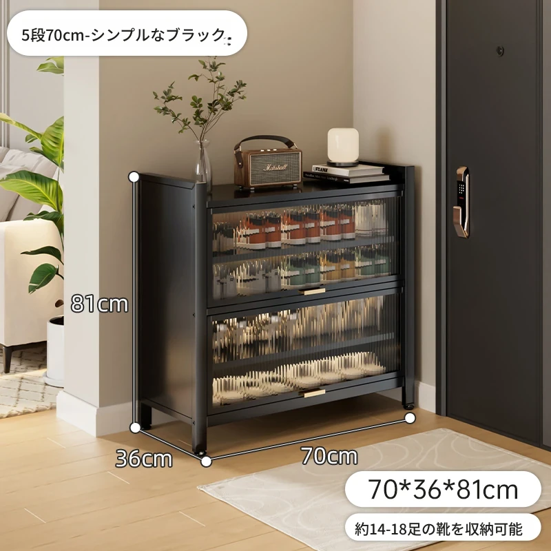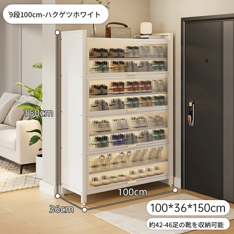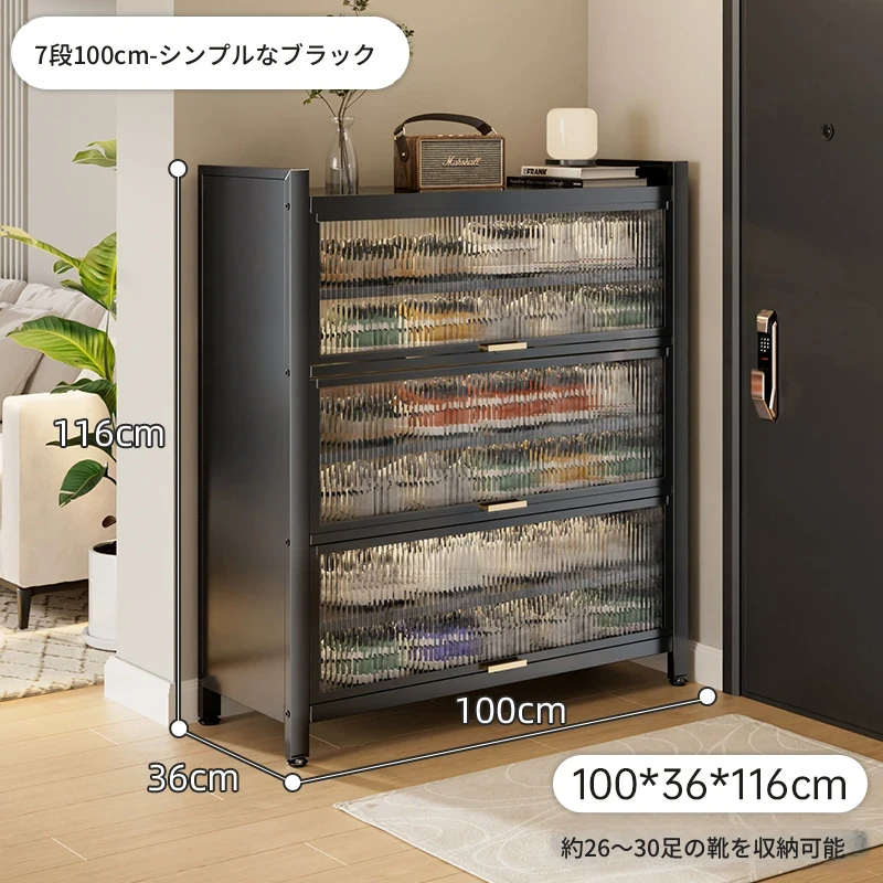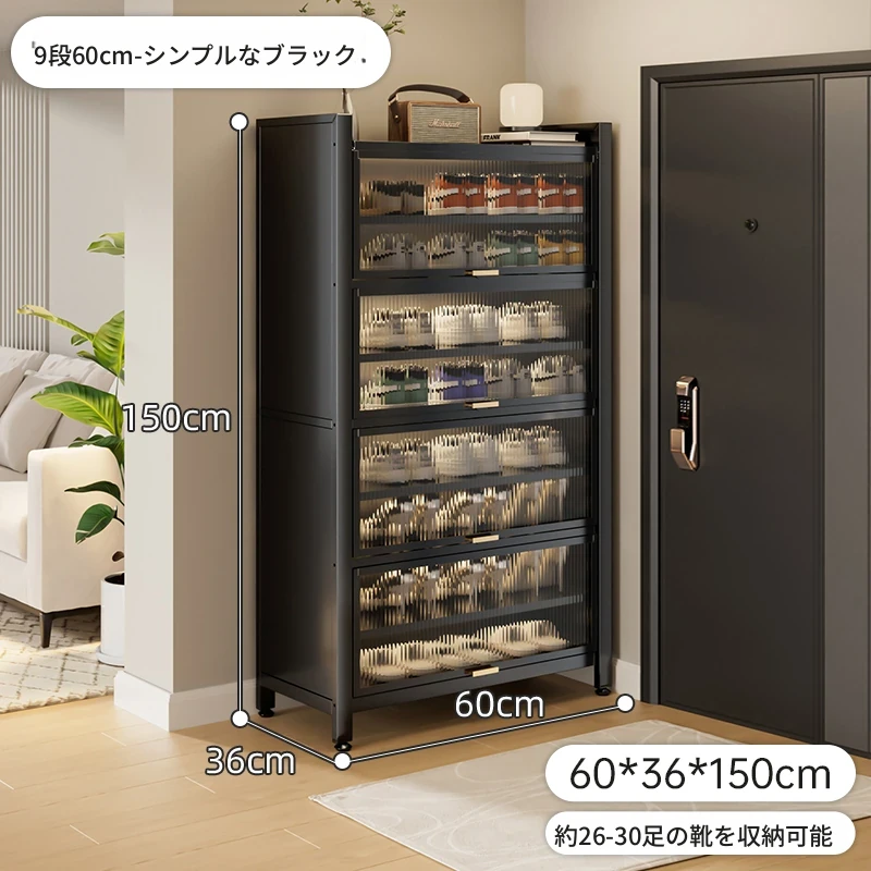 スチール製シューキャビネット - 壁面にぴったりフィット!玄関や廊下に最適な収納力を誇る、埃から守る落地型シューラック。家の入り口をスタイリッシュに整頓しましょう!