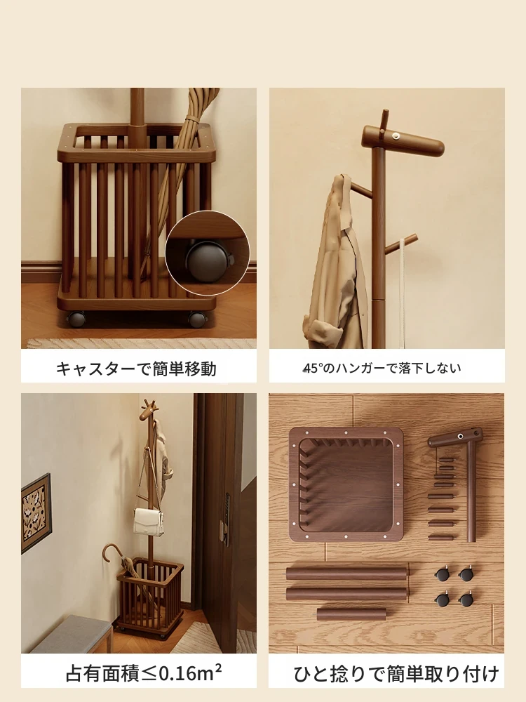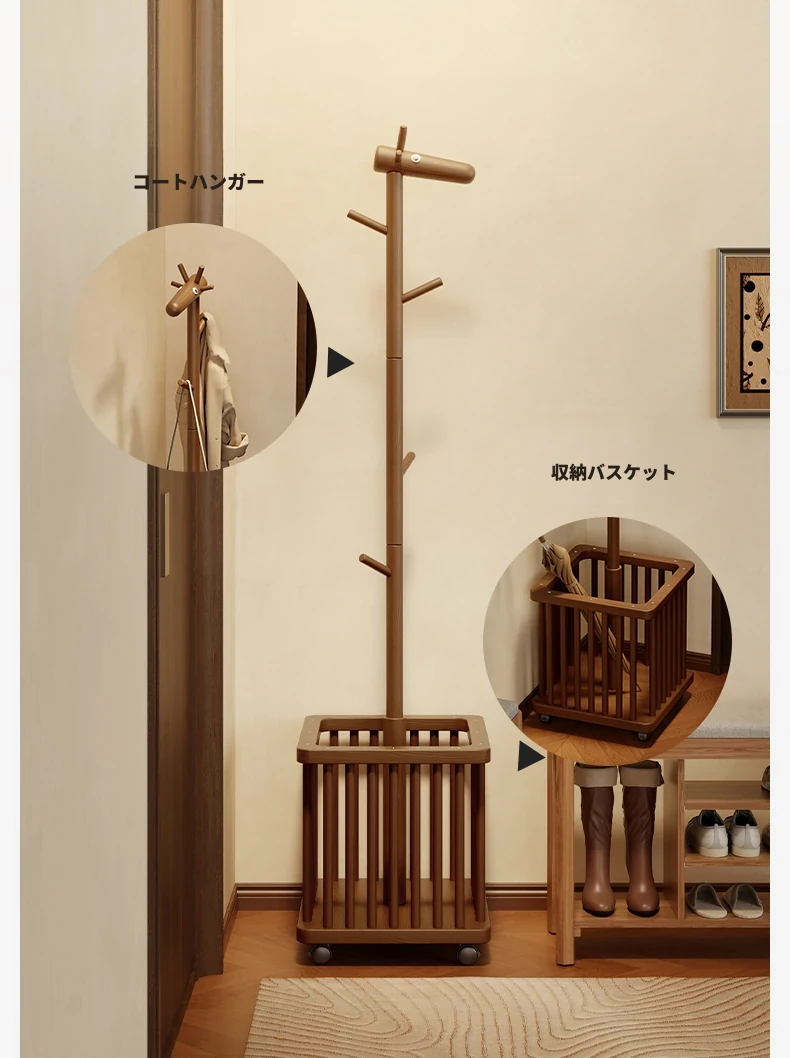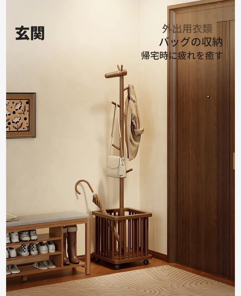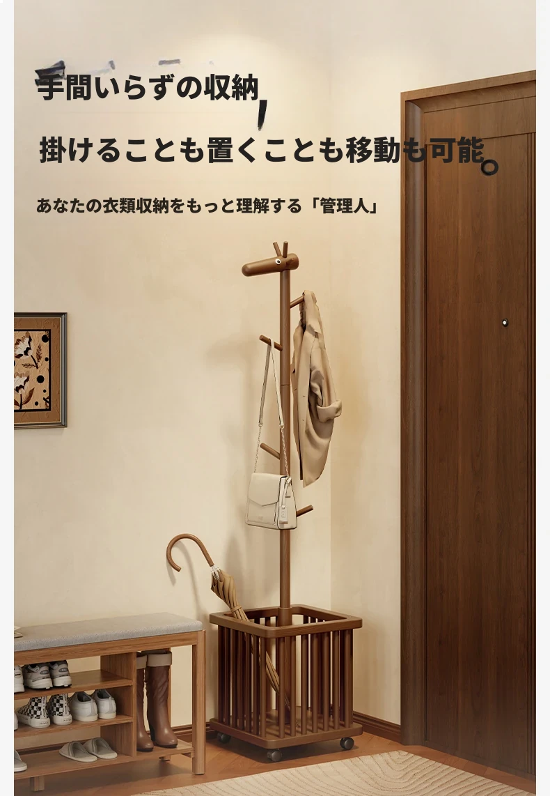 実木製の衣類ハンガー、家庭用玄関用・子供用衣類ラック、寝室にも最適!移動可能なキャスター付き、コンパクトで狭いスペースにもぴったりな収納ラック!あなたの生活空間をスタイリッシュに演出します!