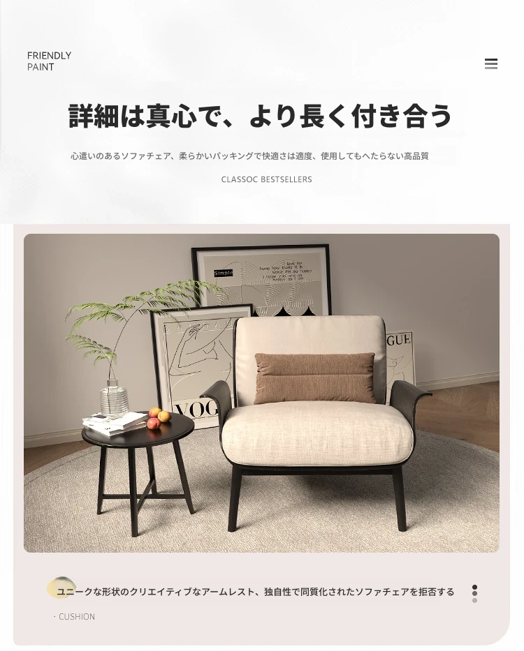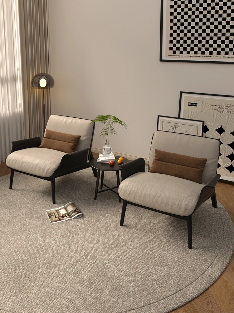 北欧スタイルの一人掛けソファ、布製でおしゃれなデザイン!アメリカンウッドのコーヒーテーブルにぴったりなリビング用L字型ソファ。リラックスできる虎のような居心地の良さを体験してください!