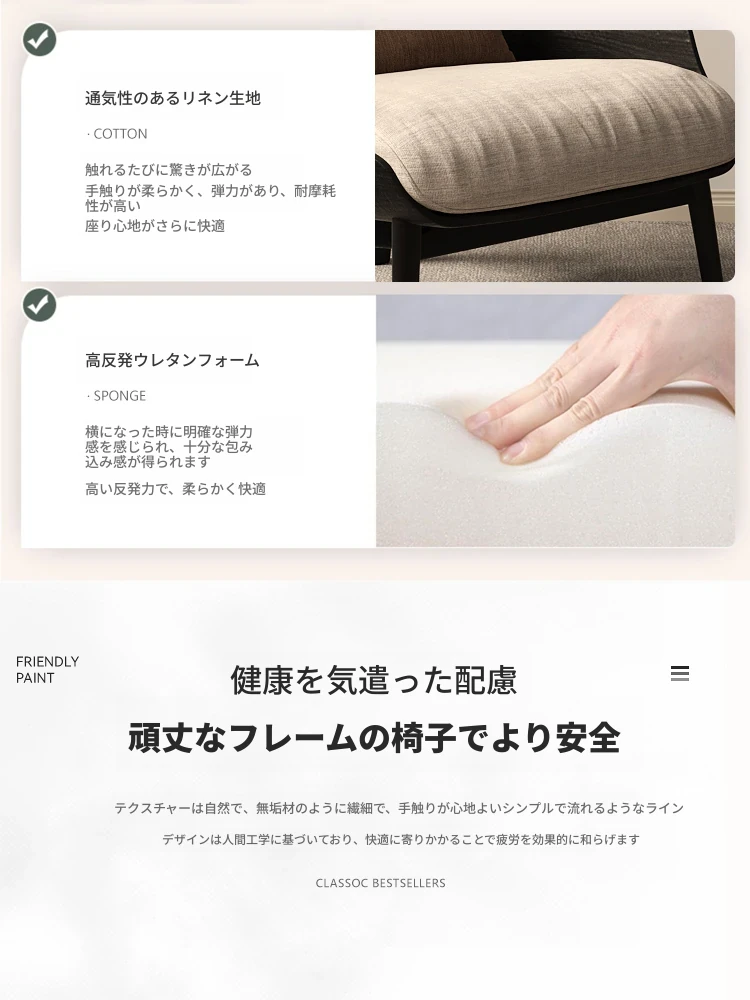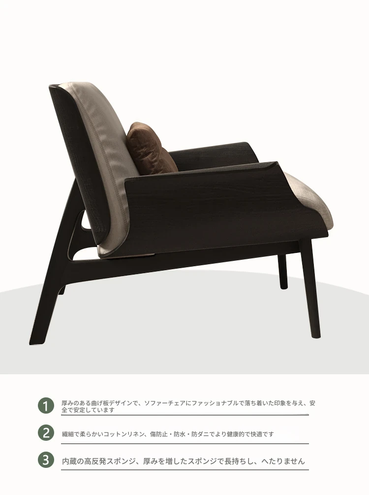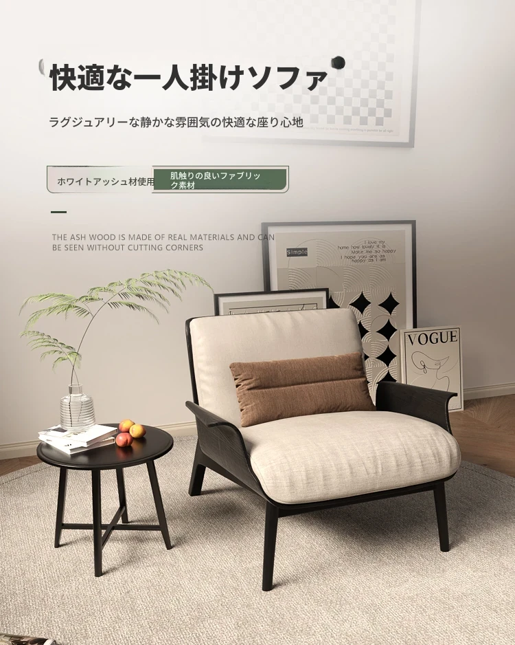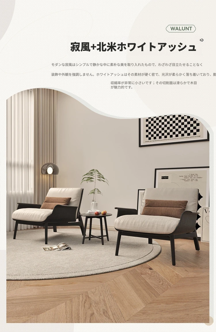 侘寂スタイルのデザイナー単人用ソファチェア - モダンでシンプルな本格的な木製リラックスチェア。リビングルームや寝室にぴったりな布製のダウンタイムチェア、あなたの空間に洗練された美を加えます!