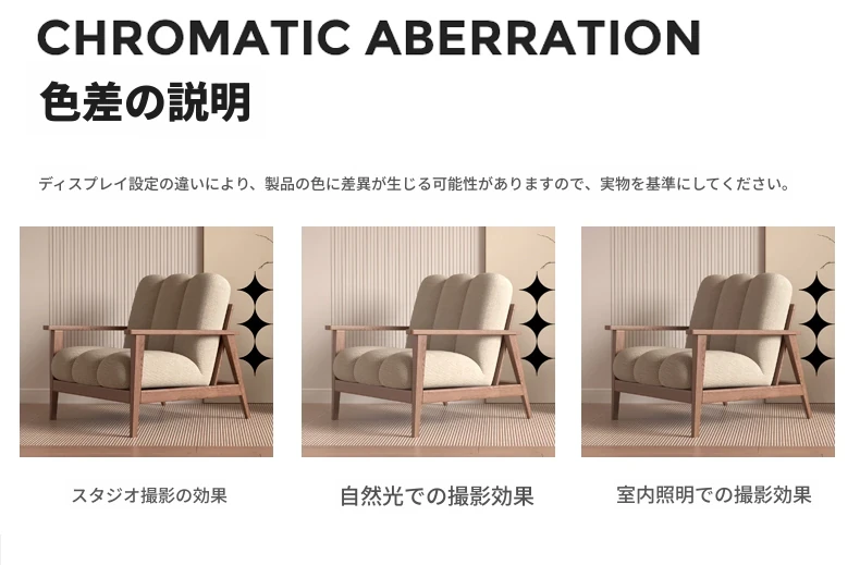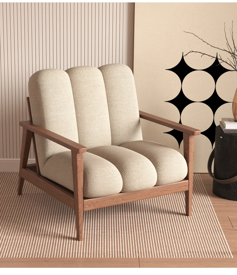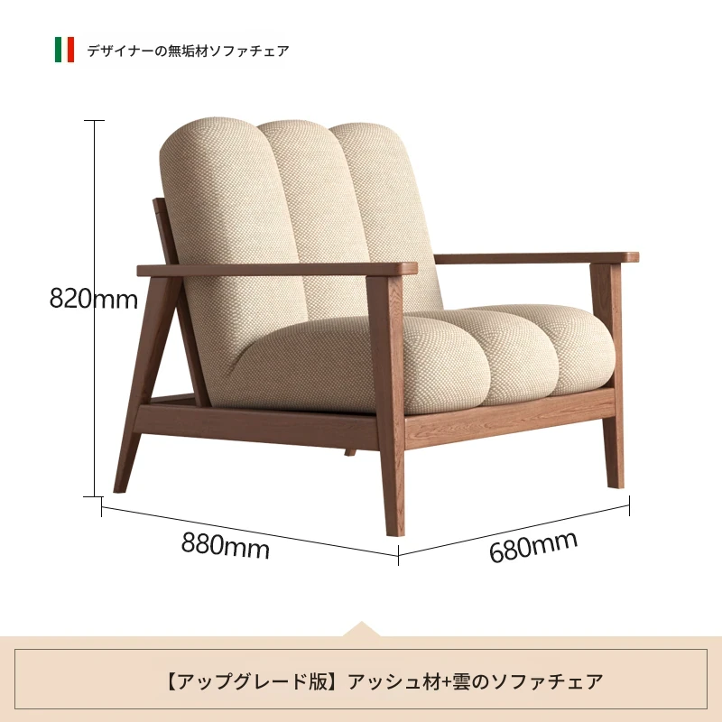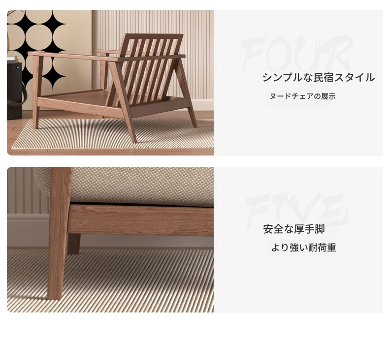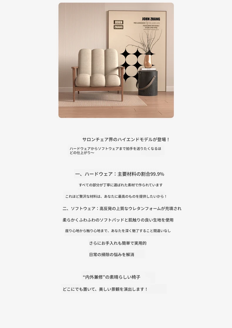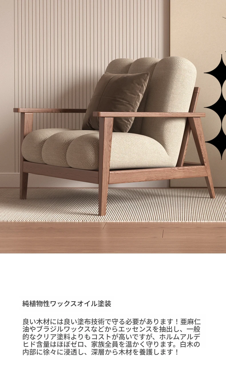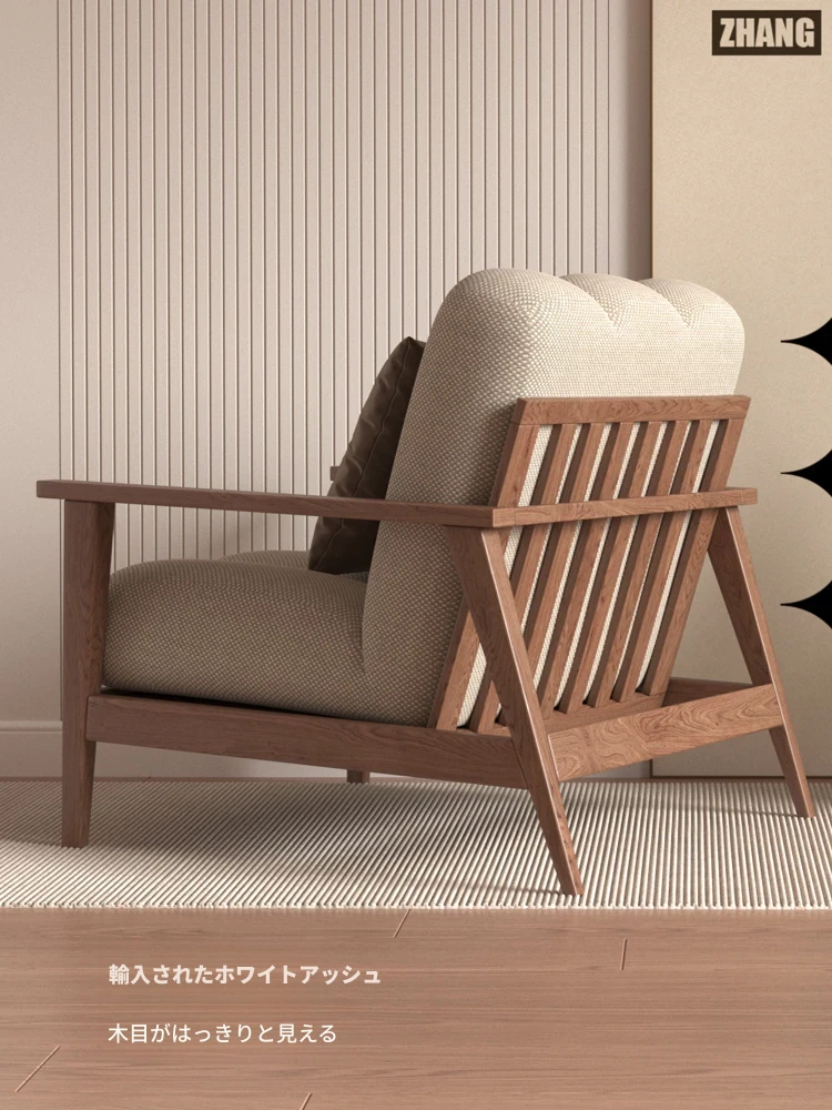 侘寂風の無垢材を使用したデザイナー創造の一人掛けソファ。北欧モダンスタイルのシンプルで洗練されたリラックスチェア。おしゃれな空間を演出し、心安らぐひとときを提供します。